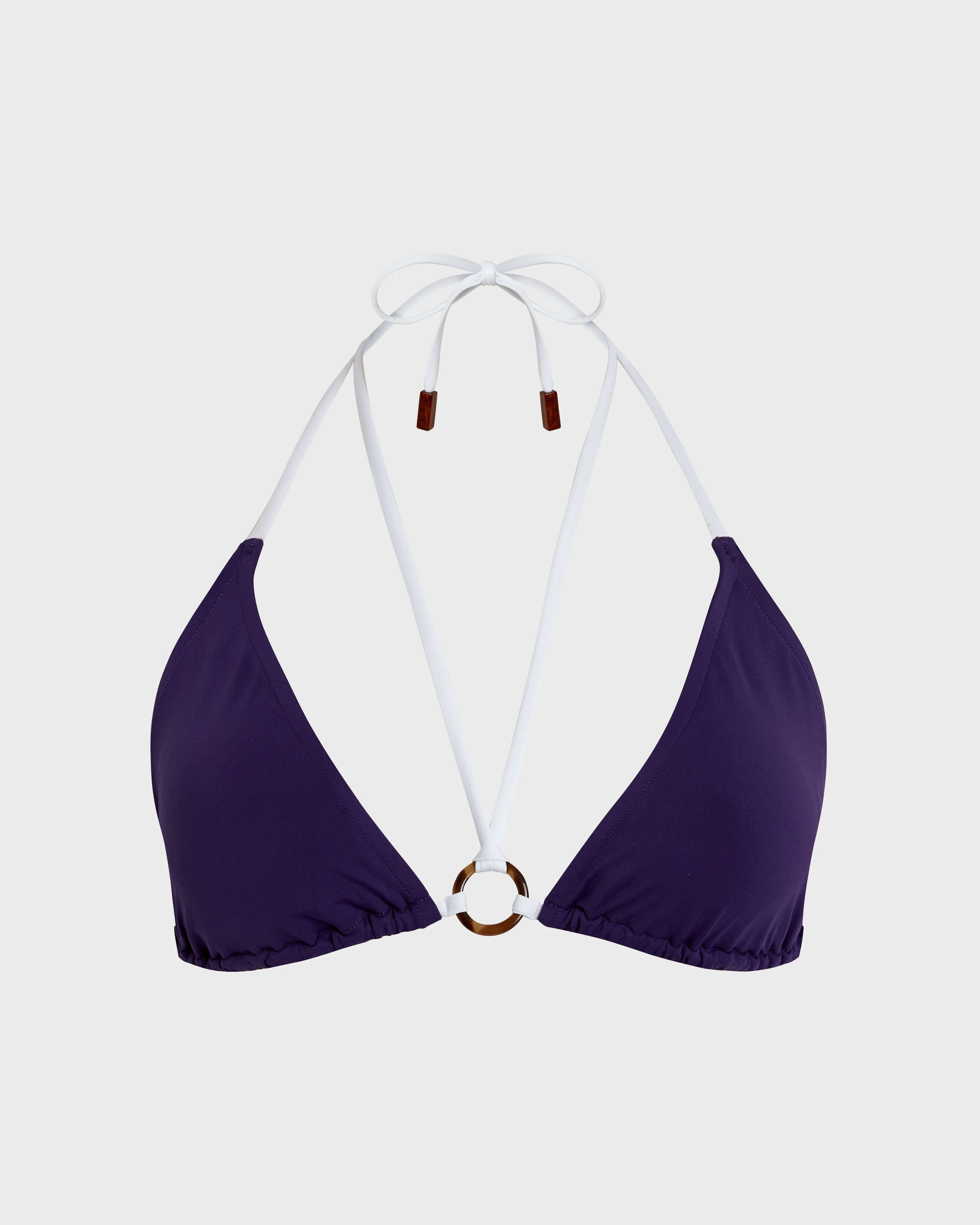 Product Detail - Style : Florane - Model : LFOCG101-805 - Colour : VIOLETTE / PURPLE 82% recycled polyamide 18% elastane - Triangle bikini top - Bicolored ties to tie at the neck and back, with tortoise endings - Central "turtle shell" imitation ring with a decorative tie connected to the neck strap - Removable cups - B cup for size S - The model is 5'9" and wears a S size - Solid stretch jersey fabric - Women Triangle Bikini Top Solid - Women Bikini Our Styles Icon title Icon description Icon title Icon description This is a carousel, you can use it by navigating through the slides using the arrows or swipe gestures. Halter tops The halter bikini top features adjustable tie at the neck, offering sensuous curves and perfect support. Triangle tops The women's triangle swimsuits can be adjusted to flatter any body type, thanks to their ties at the neck and back. Bandeau tops The bandeau top guarantees a perfect tan. A silicone band ensures good support. Underwire tops The Vilebrequin's underwired swimwear provides flawless support for women with a larger bust. Brief Skimpy and high-cut at the back, these bottoms are a staple of any beach wardrobe. Tanga The Tanga bikini bottom offers a flattering cut that elongates the legs and enhances natural curves. Tied The tied bikini bottom features adjustable side ties for a customizable fit, offering comfort. Shorty Vilebrequin's women’s shorts guarantee a sporty-chic silhouette for the modern fashionista. Bustier The one-piece swimsuit features a classic cut and clean lines, offering a versatile, hybrid style with removable straps that can transform it into a bustier. Classic The classic women's one-piece swimsuit offers a line as advantageous as it is elegant. Asymmetric The asymmetric swimsuit offers a modern, eye-catching design with a unique one-shoulder silhouette. Trikini The Trikini swimsuit is designed with a flattering V neckline and a daring low back. Sleeves This long-sleeve one-piece swimsuit features advanced UV protection fabric. View all styles Care To take care of your Bikini we advise you to follow our suggestions below: - Wash at 86F - Dry line in the shade - Do not bleach - Do not tumble dry - Iron at low temperature - Do not dry clean