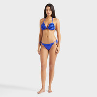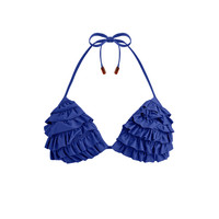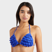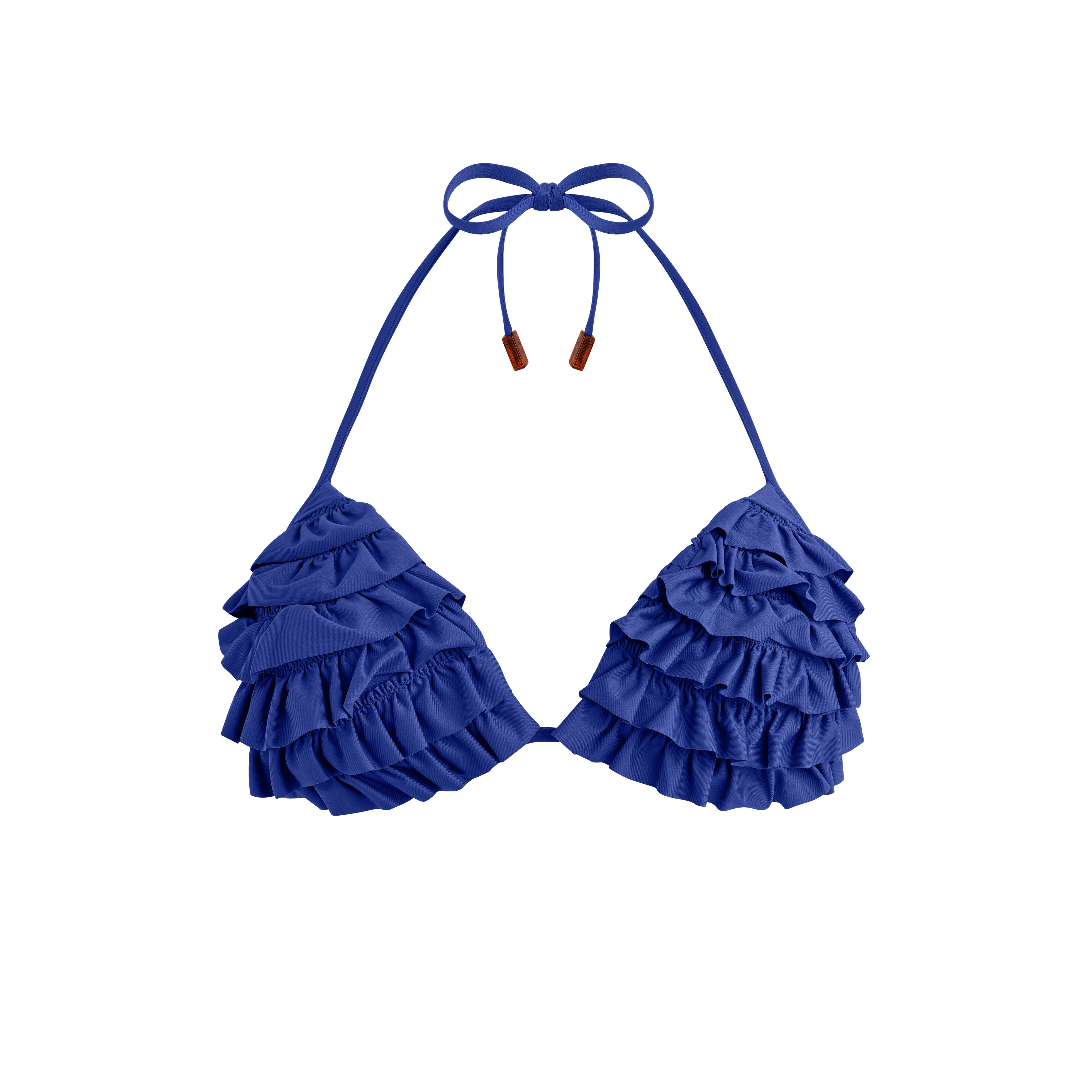 Flattering ruffles enhance this triangle bikini top in Marrakech blue. Features back and neck ties with Vilebrequin engraved tips and removable padding for comfort. - Triangle bikini top women - Back and neck to be tied - Frills - Fixed padding and removable one - The model is 5'9.69" and wears a S size - Women Bikini Top - Women Bikini Top Solid - 82% recycled polyamide 18% elastane Product Information Style: Fleurly Model: FLYCG101-613 Color: MARRAKECH / BLUE