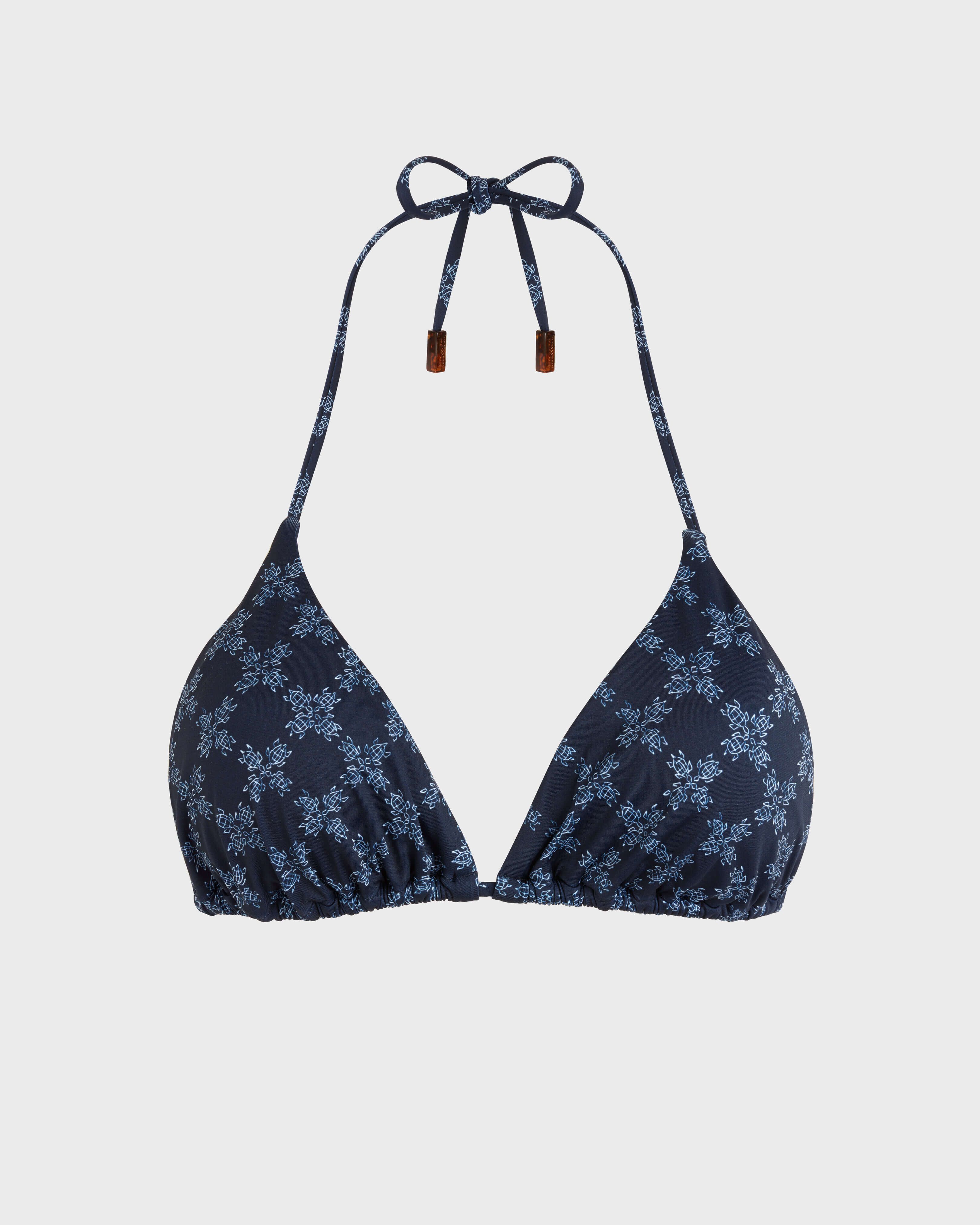 - Women triangle bikini top, back and neck to be tied - Vilebrequin engraved tortoise detail - Removable padding cups - Size S measures to a B-cup - Women triangle swimwear - Turtles Monogram women swimwear - Model wears size S - Model measurements: Chest 84cm, Height 175cm, Waist 59cm, Hips 85cm - 80% Polyamide - 20% Elasthanne