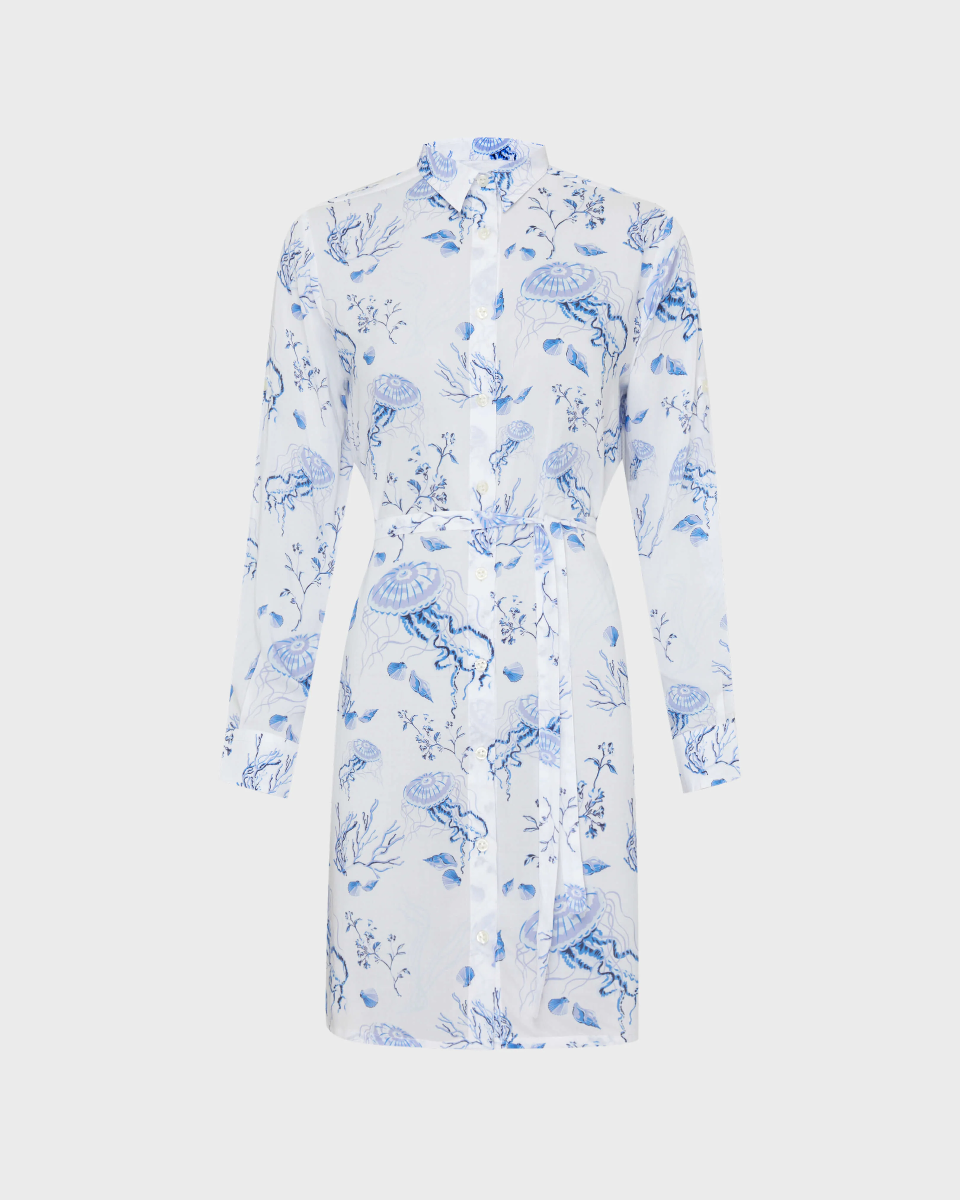 An easy-to-wear summer shirt dress featuring a neat collar, button-up front and tie belt. Crafted from viscose for a cool feel and embellished with a tonal turtle on the hem. - Women Dress Shirt - Long cut and long sleeves - Tone on tone embroidered Turtle on left bottom hem - Belt to be tied - Middle back length for a size S: 91.00cm - Women Shirt dress - Women Shirt dress Medusa and Shells - 100% viscose Product Information Style: Florence Model: FNCCX426-010 Color: WHITE / WHITE