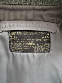 VERY RARE VINTAGE JACKET FLIGHT BOMBER MA 1 ALBER TURNER KOREAN WAR Marked size: LARGE Shoulder to shoulder: 20 Pit to pit: 26,5 Length: 25,5 Sleeve length: 26 Please make sure to check all pictures and measurements before buying, used product might have some discoloration, marks, scuff, or stains and colors can differ slightly from one monitor to another. You can always ask us to take more picture. Shipment Policy: - Please leave us your CONTACT NUMBER, as it is MANDATORY when shipping your item or else, we will put in a random contact number with consequences the item might get rejected or returned by post services. - Orders are processed within 1-3 working days. Some post services require you to pick up the item at your nearest post office, this depends on the post services, so please always keep checking the post tracking. - International shipping usually takes more than 7-14 working days, it could be either faster or longer. Exchange & Returns Policy: - Since we are selling a used product, we did NOT accept any exchange, refunds, or returns. - Make sure you recheck the whole description, measurement, and pictures. Do not hesitate to ask us anything, we always ready to answer your questions. Follow us on IG: @vintage.collections