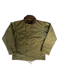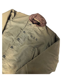 VERY RARE VINTAGE JACKET DECK N1 ALPACA LINED USN US NAVY WWII MINT CONDITION Marked size: LARGE Shoulder to shoulder: 18 Pit to pit: 22 Length: 27 Sleeve length: 24 Please make sure to check all pictures and measurements before buying, used product might have some discoloration, marks, scuff, or stains and colors can differ slightly from one monitor to another. You can always ask us to take more picture. Shipment Policy: - Please leave us your CONTACT NUMBER, as it is MANDATORY when shipping your item or else, we will put in a random contact number with consequences the item might get rejected or returned by post services. - Orders are processed within 1-3 working days. Some post services require you to pick up the item at your nearest post office, this depends on the post services, so please always keep checking the post tracking. - International shipping usually takes more than 7-14 working days, it could be either faster or longer. Exchange & Returns Policy: - Since we are selling a used product, we did NOT accept any exchange, refunds, or returns. - Make sure you recheck the whole description, measurement, and pictures. Do not hesitate to ask us anything, we always ready to answer your questions. Follow us on IG: @vintage.collections