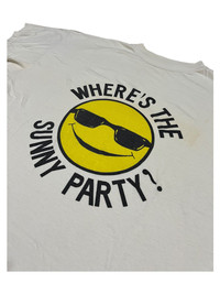 VERY RARE VINTAGE T SHIRTS SMILEY SUNNY PARTY Marked size: - Shoulder to shoulder: 24 Pit to pit: 25,5 Length: 27 Sleeve length: 7 Please make sure to check all pictures and measurements before buying, used product might have some discoloration, marks, scuff, or stains and colors can differ slightly from one monitor to another. You can always ask us to take more picture. Shipment Policy: - Please leave us your CONTACT NUMBER, as it is MANDATORY when shipping your item or else, we will put in a random contact number with consequences the item might get rejected or returned by post services. - Orders are processed within 1-3 working days. Some post services require you to pick up the item at your nearest post office, this depends on the post services, so please always keep checking the post tracking. - International shipping usually takes more than 7-14 working days, it could be either faster or longer. Exchange & Returns Policy: - Since we are selling a used product, we did NOT accept any exchange, refunds, or returns. - Make sure you recheck the whole description, measurement, and pictures. Do not hesitate to ask us anything, we always ready to answer your questions. Follow us on IG: @vintage.collections