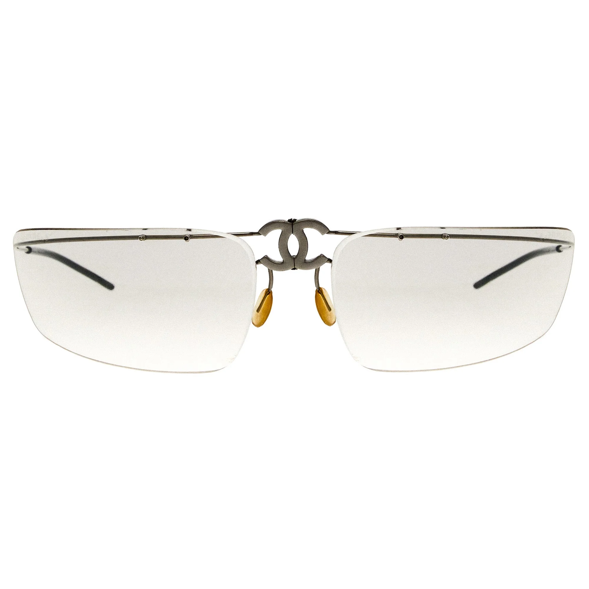 The Chanel 4002 103 5I frame, with its silver frame and iconic rectangular silhouette, is a rare vintage frame find for collectors. Vintage Chanel sunglasses from the 1990s, designed by Karl Lagerfeld, captured the essence of luxury and sophistication. These iconic pieces were celebrated for their bold frames and intricate detailing, making them a must-have accessory for fashion enthusiasts. Celebrities like Naomi Campbell and Cindy Crawford were frequently spotted wearing these vintage sunglasses on the runway and at high-profile events. Chanel's ad campaigns featured stunning visuals that showcased the elegance and allure of these shades, often shot in glamorous locations. Distributed in exclusive boutiques and high-end department stores worldwide, these Vintage Chanel sunglasses became synonymous with luxury. The iconic interlocking CC logo adorned the frames, symbolizing high fashion and timelessness. Vintage Frames Company boasts the largest designer vintage sunglasses archive in the world, featuring an extensive collection of Vintage Chanel sunglasses from the 1990s and 2000s.
