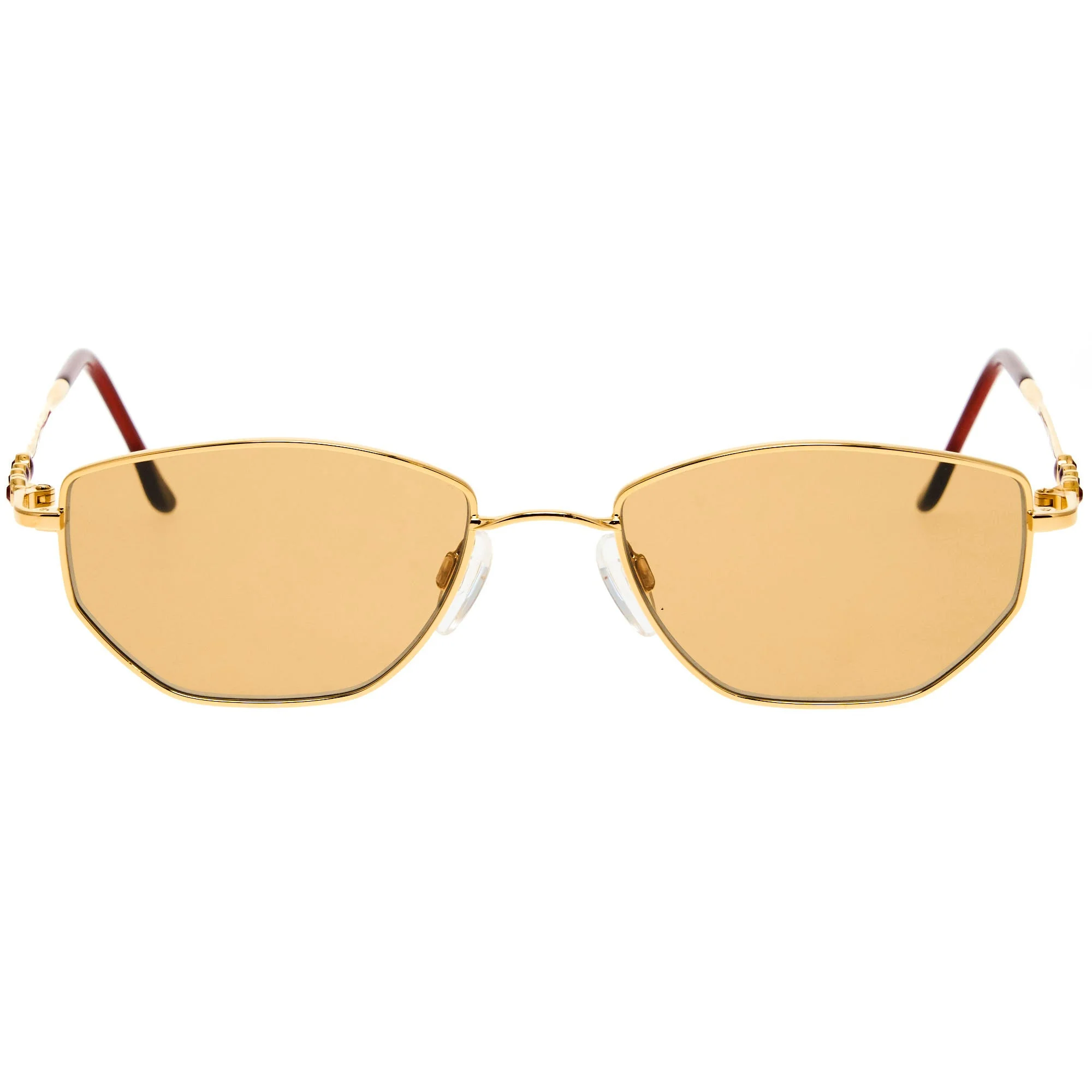 The Faberge FB019/20 6055 (Amber) vintage sunglasses, with its gold frame and iconic rectangular silhouette, is a rare vintage sunglasses find for collectors. From royal courts to the runways of today, Faberge remains a beacon of design innovation. In the 90s and 2000s, the brand brought its rich decorative language to sunglasses, introducing bold shapes, gold embellishments, and luxurious finishing touches. Each pair was meticulously crafted to reflect the grandeur of Faberge’s legacy, blending timeless design with the era’s expressive fashion culture. These rare pieces are beloved by collectors and fashion editors for their artistry and presence. Discover vintage Faberge sunglasses now at Vintage Frames Company.