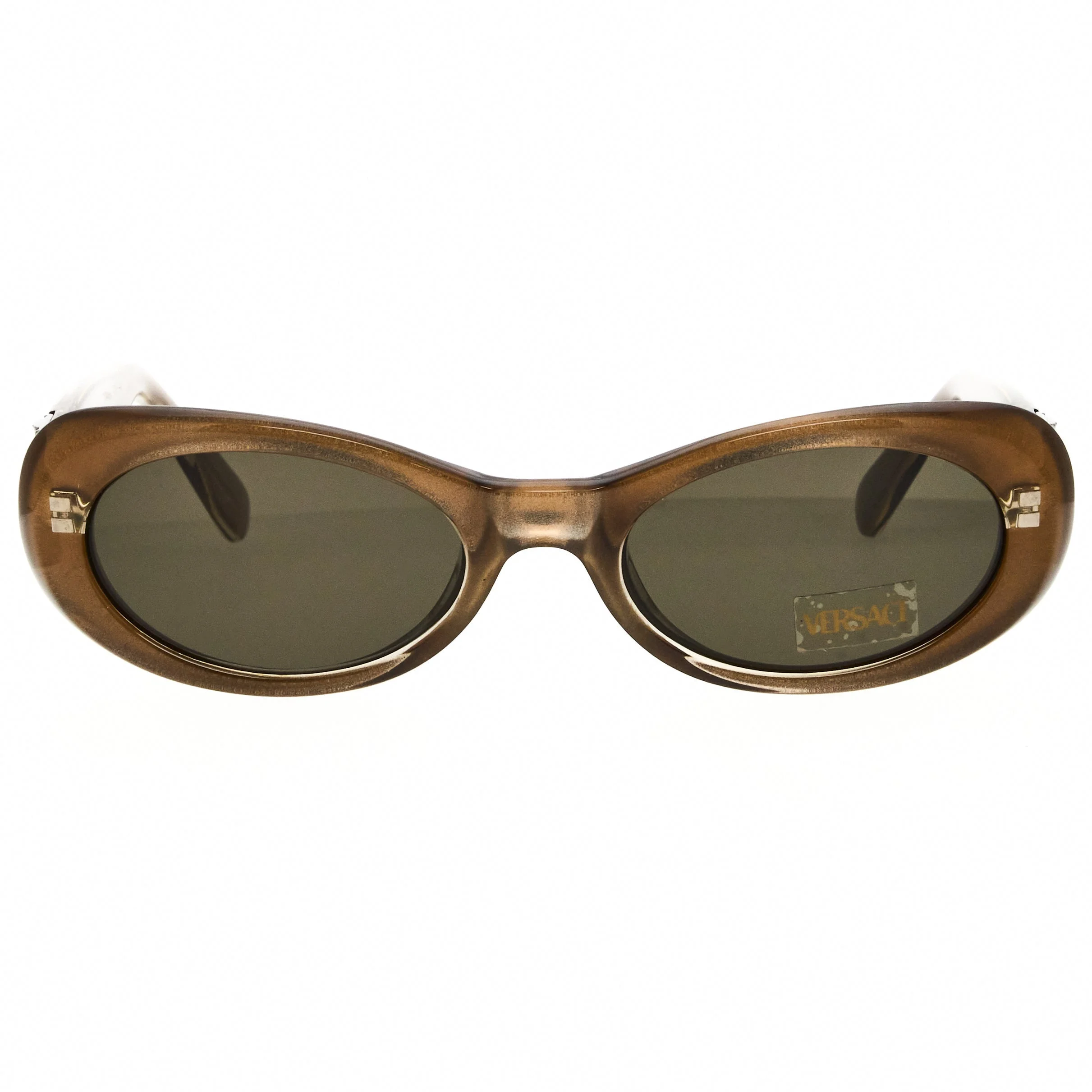 The Versace 248 327 sunglasses, with its gold frame and iconic oval silhouette, is a rare vintage sunglasses find for collectors. Experience the glamour of Gianni Versace’s world with our vintage Versace sunglasses collection, embodying the bold aesthetic that made Versace an iconic brand. Known for their distinctive Medusa and Greek Key logos, each pair is a blend of symbolism and luxury. The Medusa head represents beauty, allure, and transformation, capturing the mythical essence of Versace’s designs, while the Greek Key symbolizes continuity and strength, a tribute to Italian heritage. In the 1990s, these sunglasses were more than just accessories; they were symbols of luxury worn by celebrities and trendsetters who embraced their opulent designs. Artists like Elton John, Madonna, and models on the world’s top runways helped cement Versace sunglasses as a must-have fashion statement. Vintage Frames Company, the largest purveyor of authentic vintage designer eyewear, offers an exclusive collection of vintage Versace sunglasses, each piece selected for its timeless appeal. With Vintage Frames Company, discover the transformative power of an accessory that defines a style legacy.