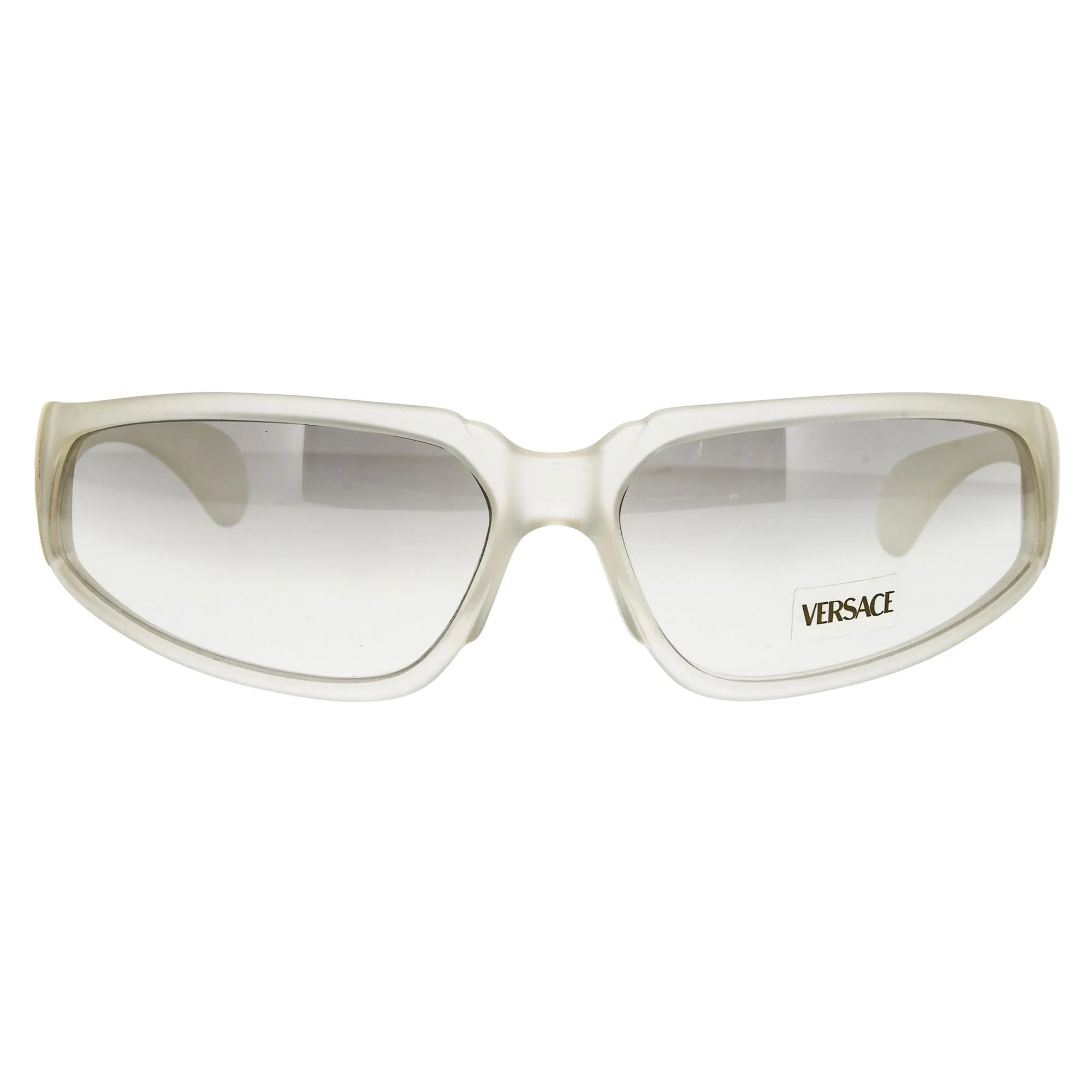 The Versace 444 Col G57 235 sunglasses, with its pearl matte frame and iconic rectangular silhouette, is a rare vintage sunglasses find for collectors. Our vintage Versace sunglasses encapsulate the bold glamour that was a hallmark of Gianni Versace’s designs. With each pair featuring the Medusa head and Greek Key, these symbols reflect power, allure, and heritage. The Medusa, inspired by mythology, embodies transformation and mystery, while the Greek Key links back to Versace’s Italian roots, symbolizing continuity. These sunglasses became iconic in the 1990s, worn by celebrities and cultural icons who valued Versace’s daring elegance. At Vintage Frames Company, we proudly present the world’s largest collection of authentic vintage Versace sunglasses, allowing you to embrace the luxury and opulence of the ‘90s.