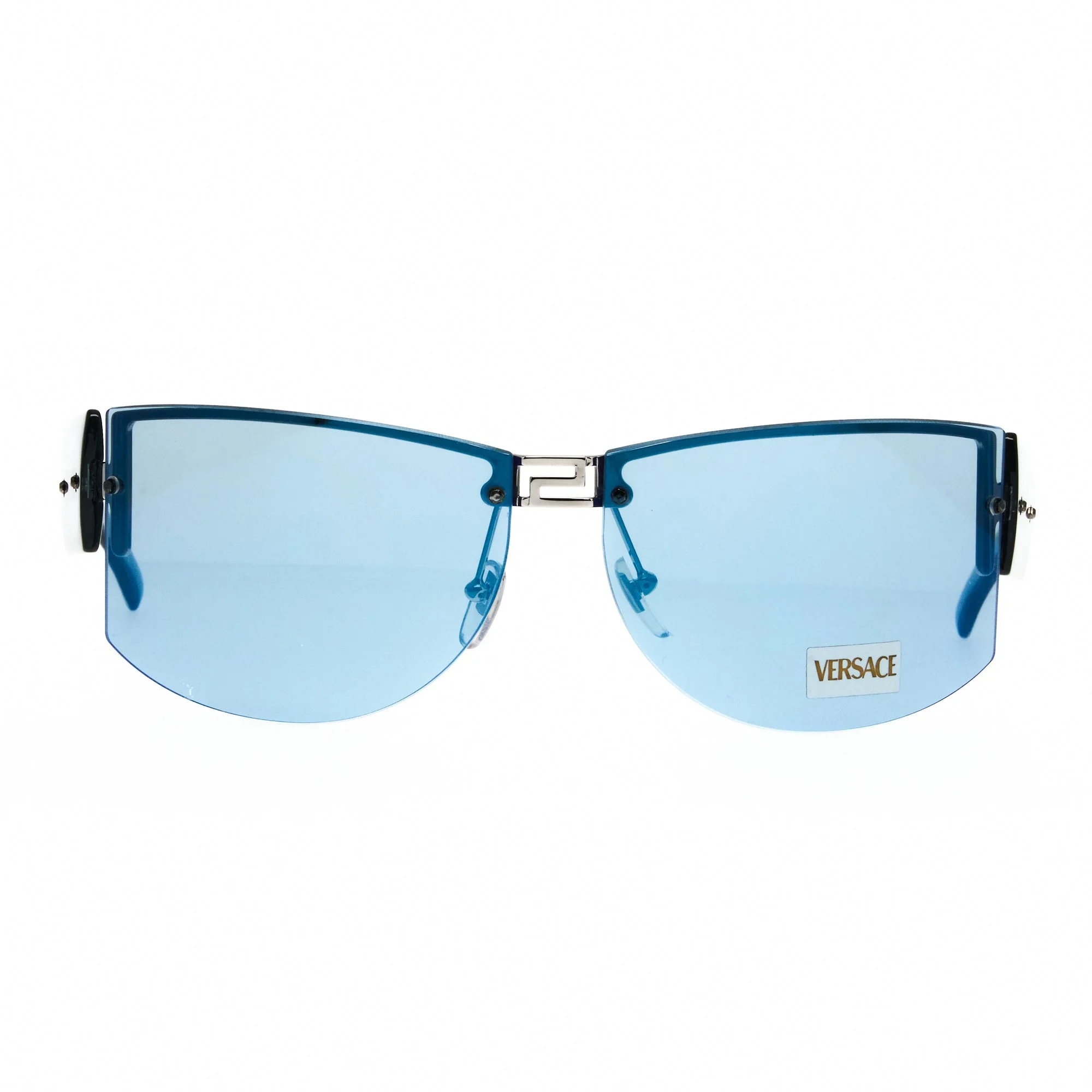 The Versace N13 Col 26M 268 sunglasses, with its blue transparent frame and iconic shield silhouette, is a rare vintage sunglasses find for collectors. Vintage Versace sunglasses are a testament to Gianni Versace’s flair for creating bold statements. With the iconic Medusa head symbolizing beauty and power, and the Greek Key representing unity and tradition, each pair is crafted to stand out. In the 1990s, these sunglasses became a must-have for tastemakers and celebrities, capturing the era’s love for luxurious accessories. Our collection at Vintage Frames Company offers the largest and most carefully curated selection of authentic vintage Versace sunglasses in the world, giving you a chance to own a piece of iconic fashion history that represents both style and legacy.