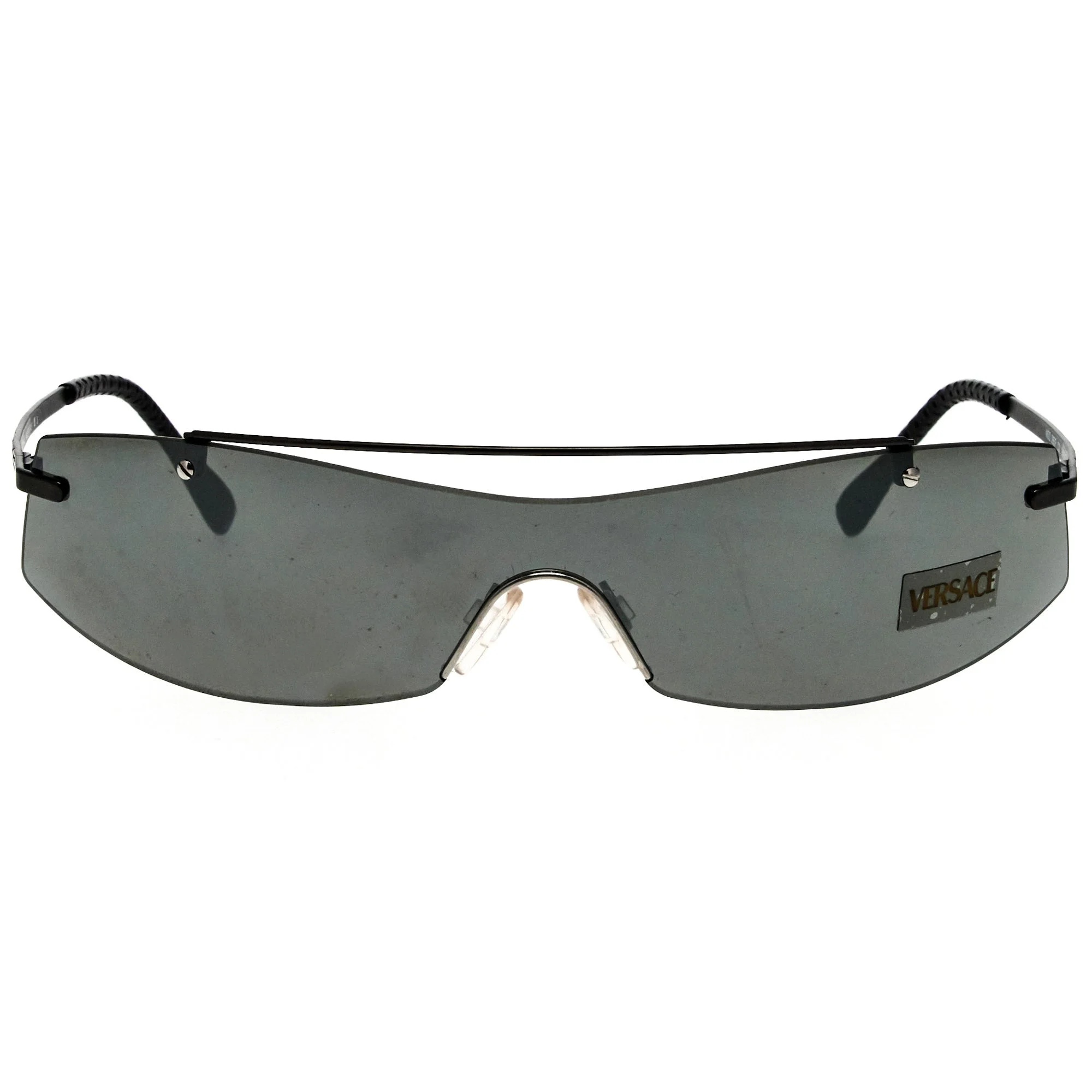 The Versace S95P 94M 247 sunglasses, with its gray frame and iconic shield silhouette, is a rare vintage sunglasses find for collectors. Vintage Versace sunglasses became synonymous with celebrity glamor in the 1990s, thanks to icons like Naomi Campbell, Tupac Shakur, and Cindy Crawford. Gianni Versace’s designs, highlighted by the Medusa and Greek Key motifs, were symbols of allure and heritage. The Medusa logo, embodying beauty and mystery, and the Greek Key, a symbol of unity, transformed each pair into a status symbol. From magazine covers to music videos, Versace sunglasses were everywhere, embodying the bold elegance of the decade. Vintage Frames Company is proud to offer the world’s largest collection of authentic vintage Versace sunglasses, each pair a nod to the stars who wore them. Rediscover this timeless style and connect with a piece of 1990s history through our curated selection.