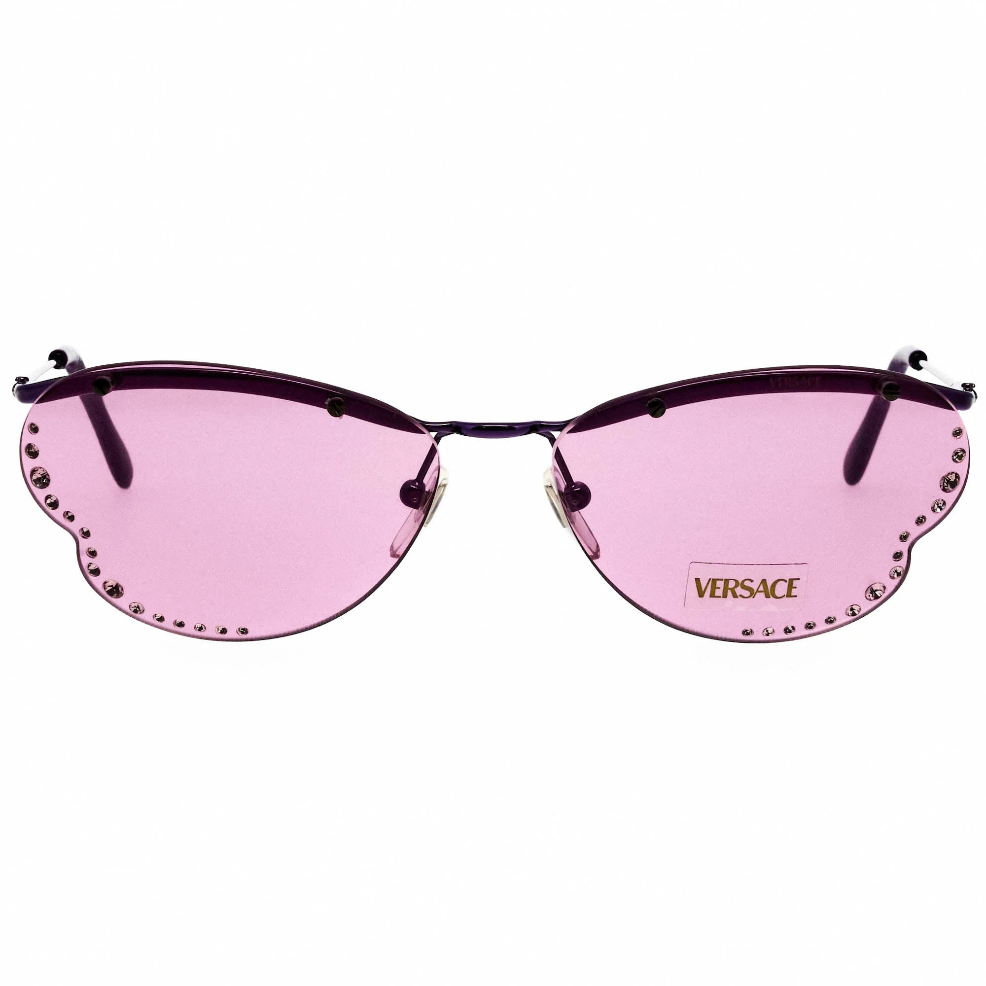 The Versace X60P 37M sunglasses, with its purple frame and iconic editorial silhouette, is a rare vintage sunglasses find for collectors. Vintage Versace sunglasses revolutionized the sunglasses market by introducing unparalleled luxury and design innovation. Gianni Versace’s use of the Medusa head and Greek Key motifs transformed sunglasses from practical accessories into high-fashion items. Versace’s daring designs encouraged consumers to embrace sunglasses as statements of identity, pushing the market towards a new era of luxury eyewear. This shift inspired other designers to experiment with bold styles and led to a demand for high-end materials and intricate detailing. Versace’s impact made sunglasses synonymous with status and elegance, cementing them as must-have fashion pieces. At Vintage Frames Company, we offer the world’s largest selection of vintage Versace sunglasses, celebrating the visionary who changed the face of eyewear. Each pair in our collection speaks to Versace’s legacy and the innovation that transformed the market forever.