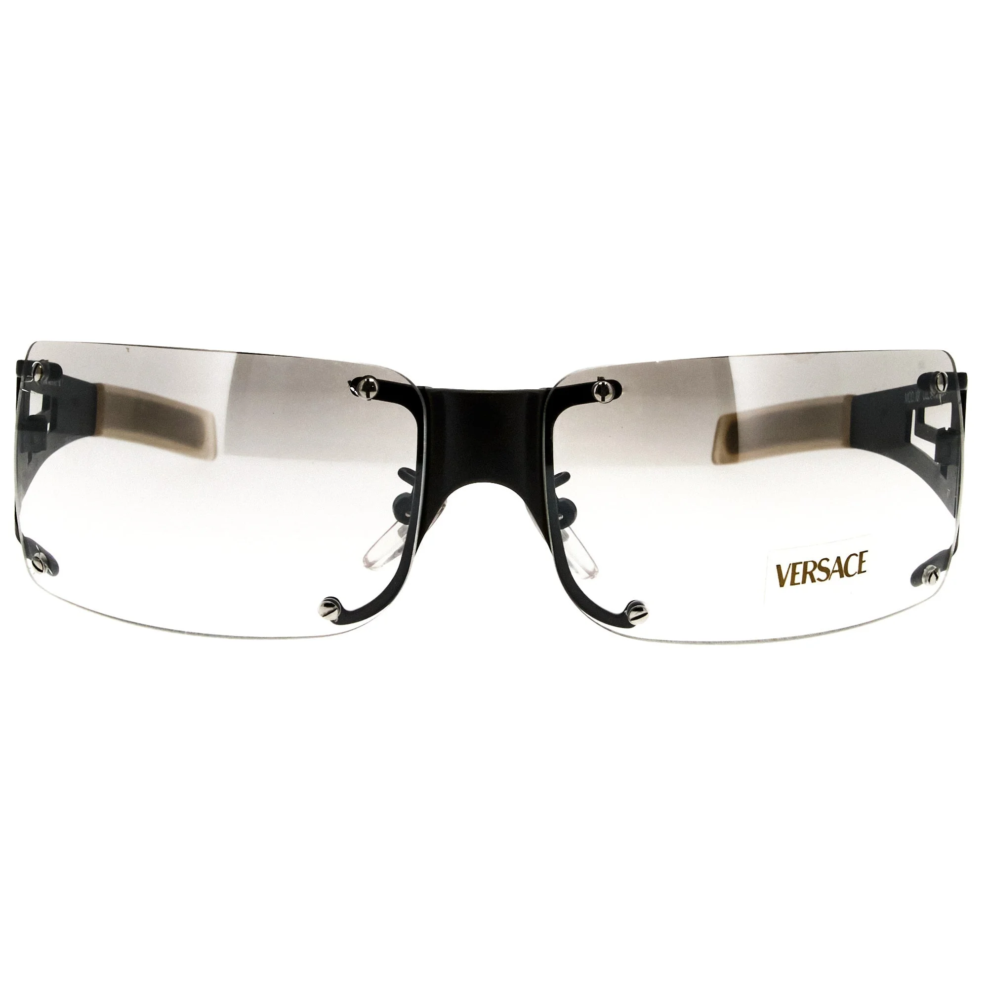 The Versace X91 94M 235S sunglasses, with its gray frame and iconic rectangular silhouette, is a rare vintage sunglasses find for collectors. Vintage Versace sunglasses became cultural icons in the 1990s, thanks to celebrities who embraced their lavish style. Supermodels like Cindy Crawford and Linda Evangelista wore these bold frames, featuring the Medusa head and Greek Key, to elevate their iconic looks. Whether on the runway or in candid photos, Versace sunglasses became a signature of high-fashion luxury. At Vintage Frames Company, we hold the largest collection of authentic vintage Versace sunglasses, so you can embody the elegance that defined an era and pay homage to the stars who made them legendary.