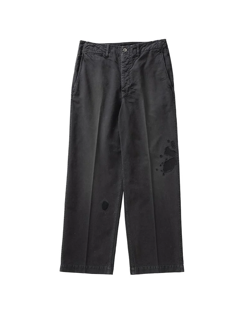 BROADER CHINO CRASH COLOR: BLACK, NAVY, BEIGE SIZE: 1, 2, 3, 4, 5 Custom High Density Weave Long Staple Cotton Chino Pants Garment Dyed and Crash Damaged Finish Wide Straight Leg Silhouette and High-Rise Custom PEERLESS Metal Buttons 100% Cotton Made in Japan UNIT:cm : SIZE LENGTH INSEAM WAIST THIGH WIDTH HEM 1 104 72 79 34.1 23.1 2 106.5 74 84 35.3 24.3 3 109 76 89 36.5 25.5 4 111.5 78 94 37.7 26.7 5 114 80 99 38.9 27.9