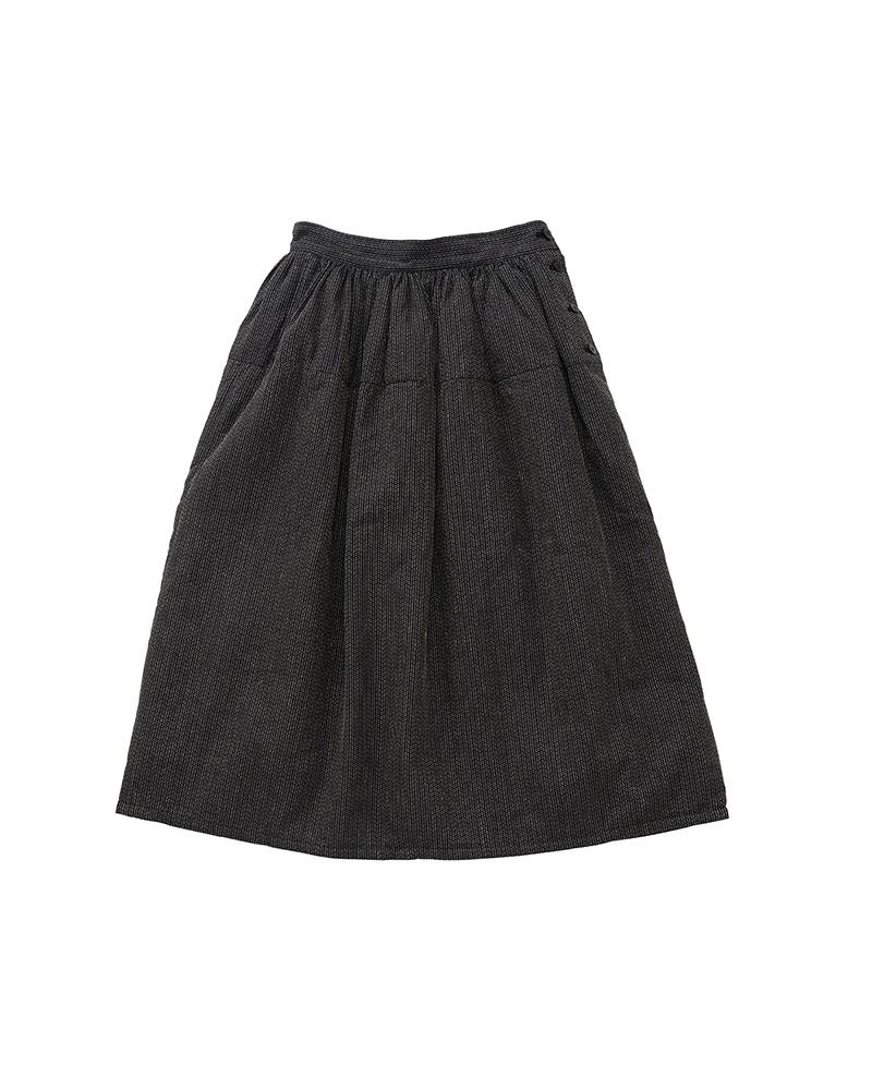 ELEVATION DOWN SKIRT W COLOR: BLACK, BLUE SIZE: 00, 0, 1, 2, 3 Custom Woven Sashiko Patterned Wool Linen Skirt One Wash White Goose Down Fill Custom Water Buffalo Buttons 65% Wool 35% Linen UNIT:cm : Please be aware that there may be slight variations in the color of the fabric and pattern than shown in the images. There will be slight shrinkage when washing for the first time. SIZE LENGTH WAIST 00 76 68 0 81 68 1 82.5 72 2 84 76 3 85.5 80