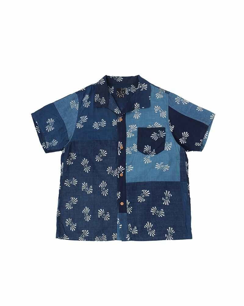 FAIRWAY SHIRT S/S (N.D.) COLOR: INDIGO PATTERN, INDIGO SIZE: 1, 2, 3, 4, 5 Patchwork shirt made from original bandanas Natural dye finish Original bamboo buttons 100% COTTON UNIT:cm : Please be aware that the vintage fabric, bandanas, blanket, and african indigo fabric used may vary in color and pattern from item to item. With time, these fabrics may also become weaker and less tear-resistant. Also, due to the use of natural dyes, the outward appearance of items may vary slightly from one another. For certain items, mud may be applied for an added effect. Products may shrink slightly when washed. SIZE LENGTH CHEST SHOULDER SLEEVE 1 63 106.8 38.7 20.6 2 65 110.8 40.2 21.3 3 67 114.8 41.7 22 4 69 119.8 43.7 22.7 5 71 124.8 45.7 23.4