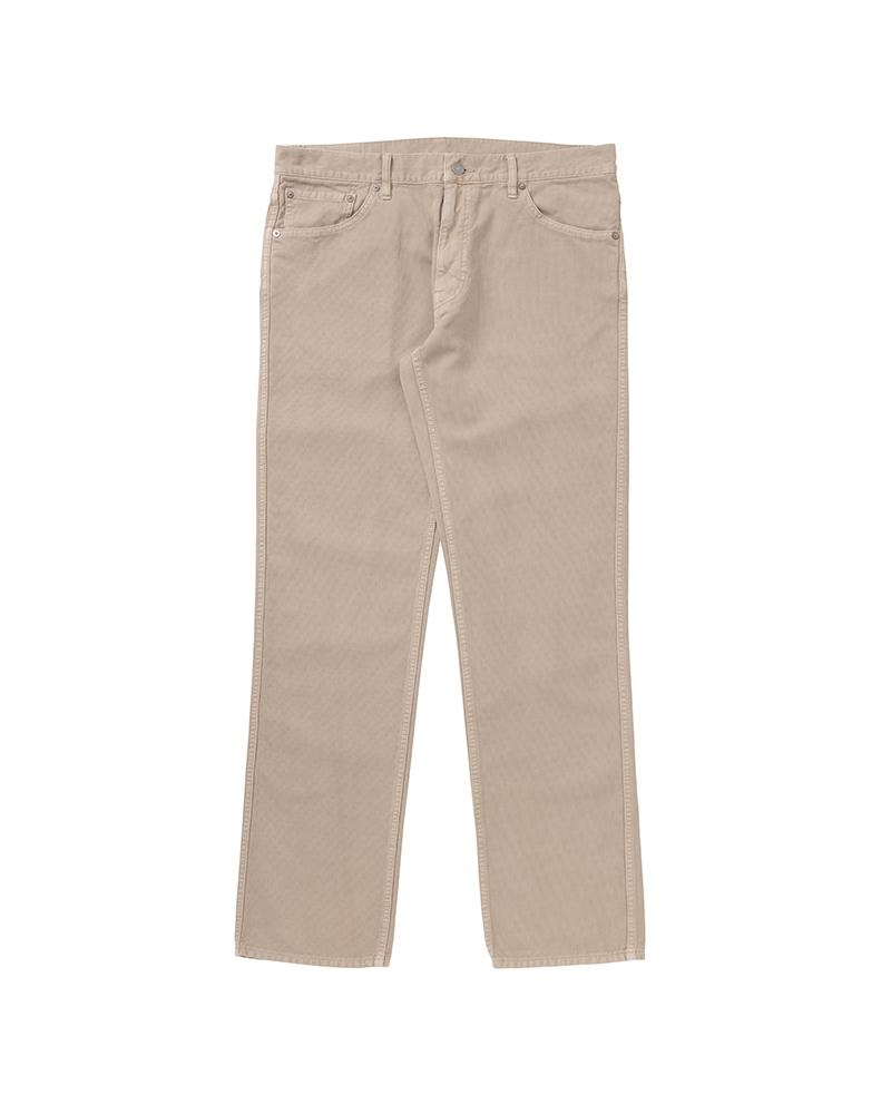 FLUXUS 03 COLOR: BLACK, NAVY, BEIGE SIZE: 1, 2, 3, 4, 5 Dry Pique fabric 5 Pocket Pant Garment Dyed Damaged Finish Regular Slim Fit, Tapered Silhouette Medium-Rise Zip Fly Custom zip fastener, Copper buttons and rivets Natural Dyed Buckskin patch 100% COTTON UNIT:cm Please be aware that there may be slight variations in the color of the fabric and pattern than shown in the images. There will be slight shrinkage when washing for the first time. SIZE LENGTH INSEAM WAIST THIGH WIDTH HEM 1 103.7 79 84 31 18.7 2 106.2 81 89 32.2 19.9 3 108.7 83 94 33.5 21.2 4 111.2 85 99 34.7 22.4 5 113.7 87 104 36 23.7