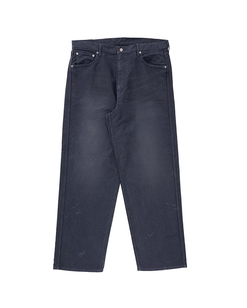 FLUXUS 05 WIDE G.CORDS COLOR: BLACK, NAVY, BEIGE SIZE: 1, 2, 3, 4, 5 Custom German Cord Cloth Five Pocket Pants Garment Dyed and Damaged Finish Regular Fit, Tapered Silhouette, High-Rise, and Zip Fly Custom Zip Fastener, PEERLESS Engraved Buttons, and Rivets Natural Dyed Buckskin Patch 100% Cotton UNIT:cm : Please be aware that there may be slight variations in the color of the fabric and pattern than shown in the images. There will be slight shrinkage when washing for the first time. SIZE LENGTH INSEAM WAIST THIGH WIDTH HEM 1 105 75.5 83 33.8 20.2 2 107.5 77.5 88 35 21.4 3 110 79.5 93 36.3 22.7 4 112.5 81.5 98 37.5 23.9 5 115 83.5 103 38.8 25.2