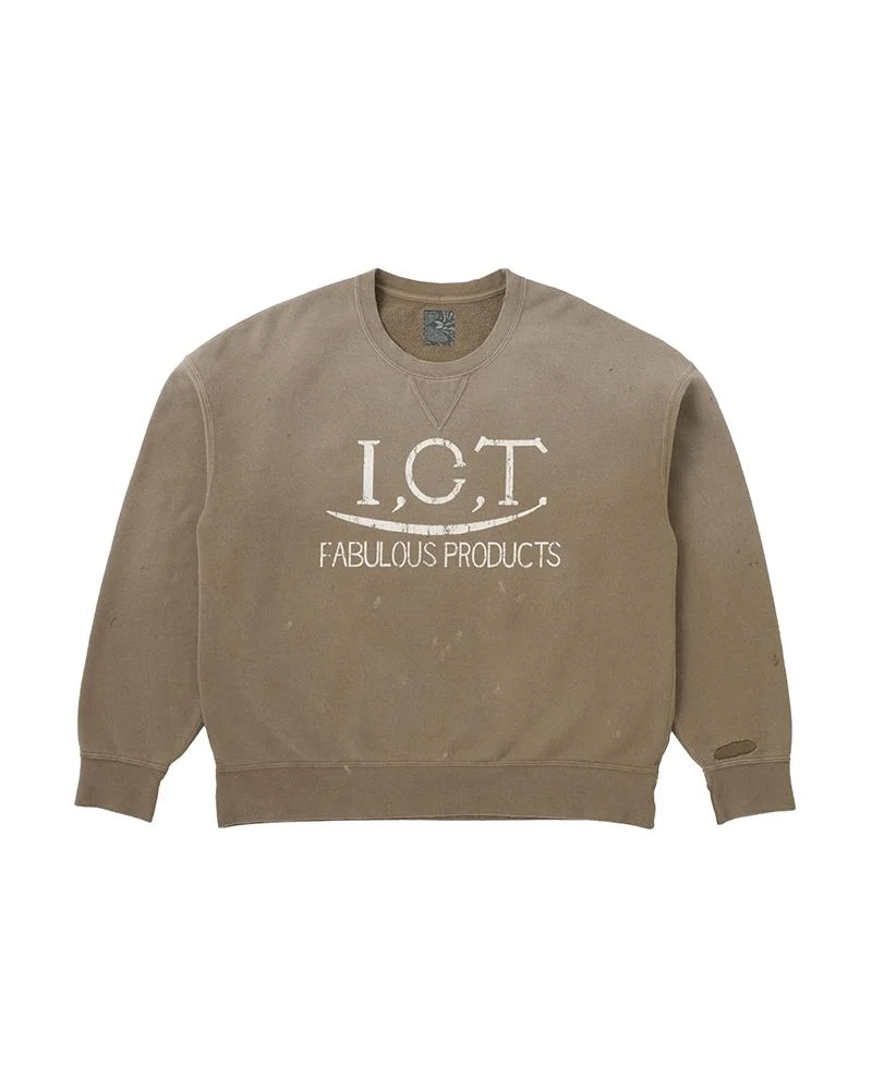 JUMBO SB SWEAT L/S CRASH COLOR: LT.BLUE, BEIGE, OFF WHITE SIZE: 1, 2, 3, 4, 5 Crewneck Long Sleeve Sweatshirt made with a french terry material Jumbo Silhouette Garment Dyed and Crash Damaged Finish "I.C.T. FABULOUS PRODUCTS" Print Detail 100% Cotton UNIT:cm : Please be aware that there is a possibility for slight variations in the color appearance and pattern on the fabric that is utilized for this product; each finished garment may be different from the displayed product image. There may also be some shrinkage following the first wash of this product. The Kofu, Bandana, Blanket, African Indigo textile and vintage fabrics used for the name tag and actual product itself vary in color and pattern where no two pieces are alike. Additionally, the degree of deterioration will vary with each fabric depending on its age and historical use so these products should be considered more fragile in comparison to our regularly manufactured products. SIZE LENGTH CHEST SHOULDER SLEEVE 1 62 110 61 49.5 2 64 115 63 51 3 66 120 65 52.5 4 68.5 125 67 54 5 71 130 69 55