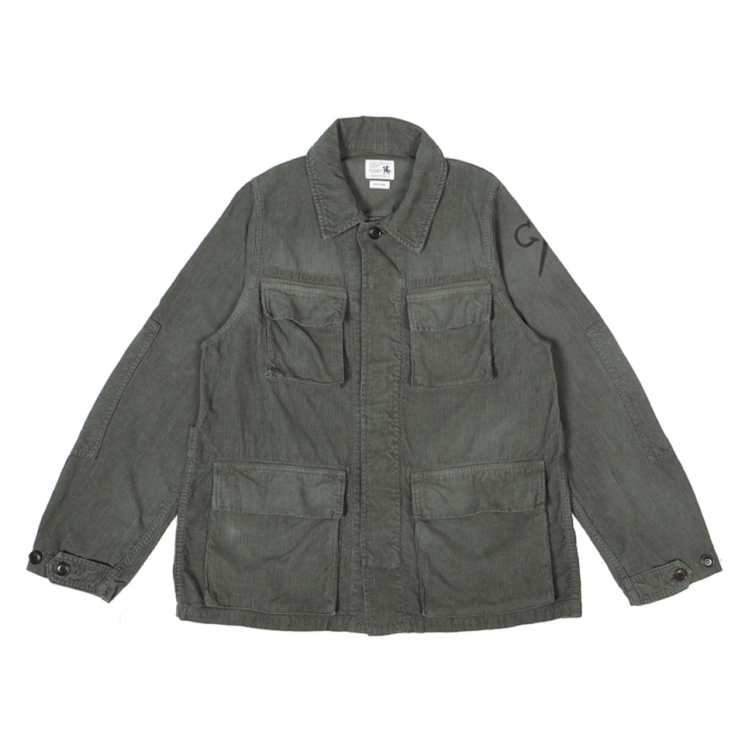 KILGORE JKT COLOR : BEIGE , OLIVE SIZE : 1 , 2 , 3 , 4 , 5 Original spun cotton-polyester corduroy jacket Damage processed Vegetable ivory buttons Hand-stenciled paint detail Please Note : 85% Cotton , 15% Polyester SIZE 1 : Length 28.1 , Shoulder 15.2 , Sleeve 26 , Chest 44.9 (inch) SIZE 2 : Length 29.1 , Shoulder 15.7 , Sleeve 26.6 , Chest 46.5 (inch) SIZE 3 : Length 30.1 , Shoulder 16.3 , Sleeve 27.2 , Chest 48 (inch) SIZE 4 : Length 31.1 , Shoulder 17.1 , Sleeve 27.8 , Chest 50 (inch) SIZE 5 : Length 32.1 , Shoulder 17.9 , Sleeve 28.3 , Chest 52 (inch) The fabric used may vary in color and pattern from item to item. Products may shrink slightly when washed.