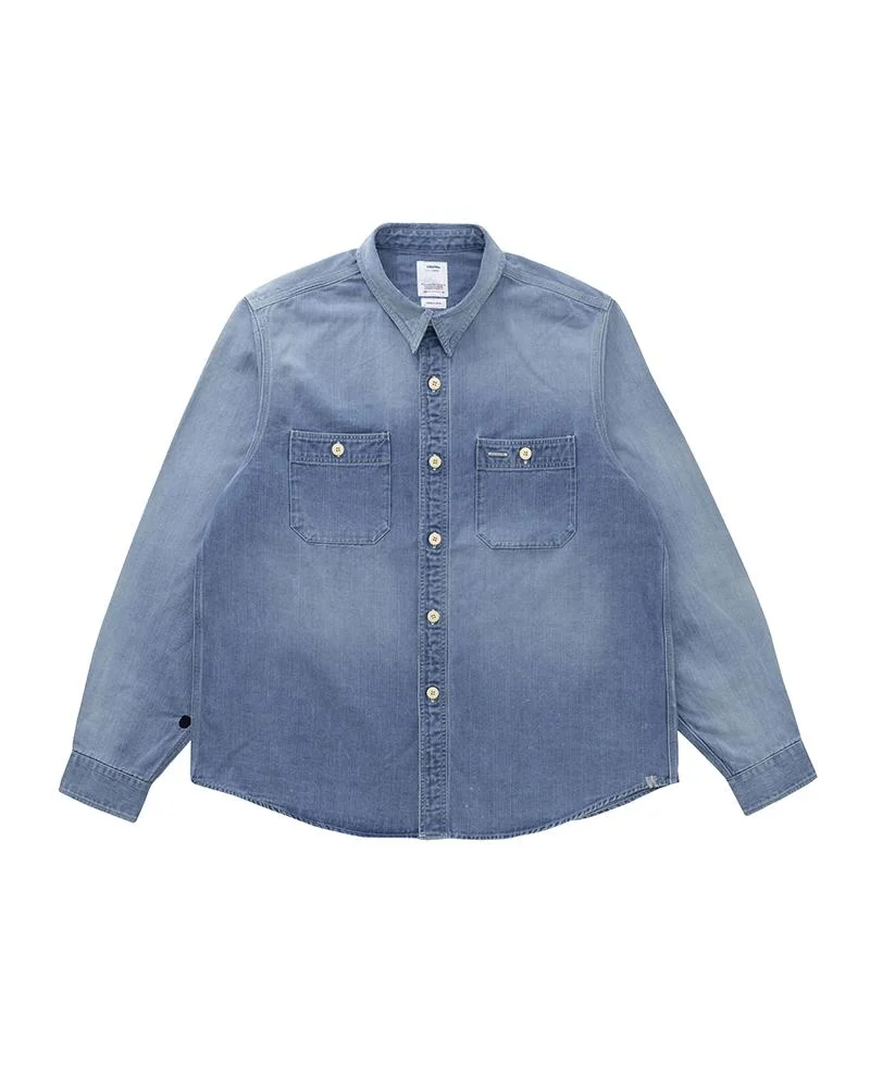 LARRIKAN L/S CRASH COLOR: BLACK, NAVY, INDIGO SIZE: 1, 2, 3, 4, 5 Custom Chambray Long Staple Cotton Chino Long Sleeve Shirt Custom Selvedge Detail Crash Damaged Finish Custom Water Buffalo Buttons 100% Cotton Made in Japan UNIT:cm : SIZE LENGTH CHEST SHOULDER SLEEVE 1 71.5 120 45 64.2 2 74 125 47 65.7 3 76.5 130 49 67.2 4 79 135 51 68.7 5 81.5 140 53 70.2
