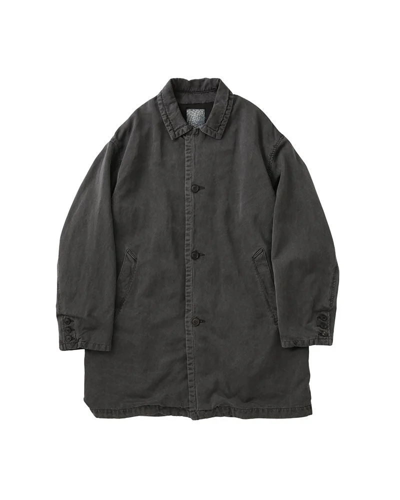 MIES COAT COLOR: BLACK, NAVY, GREY SIZE: 1, 2, 3, 4, 5 A Coat made with a Custom Wool and Linen Gabardine material Garment Dyed Custom Water Buffalo Buttons 80% Wool 20% Linen UNIT:cm : Please be aware that there is a possibility for slight variations in the color appearance and pattern on the fabric that is utilized for this product; each finished garment may be different from the displayed product image. There may also be some shrinkage following the first wash of this product. The Kofu, Bandana, Blanket, African Indigo textile and vintage fabrics used for the name tag and actual product itself vary in color and pattern where no two pieces are alike. Additionally, the degree of deterioration will vary with each fabric depending on its age and historical use so these products should be considered more fragile in comparison to our regularly manufactured products. SIZE LENGTH CHEST SHOULDER SLEEVE 1 85 125.7 58.7 55 2 87.5 129.7 60.2 56.5 3 90 133.7 61.7 58 4 92.5 138.7 63.7 59.5 5 95 143.7 65.7 61