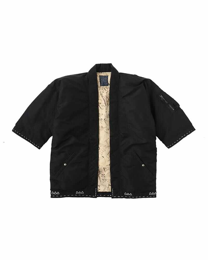 SANJURO KIMONO DOWN JKT COLOR: BLACK, OLIVE SIZE: 1, 2, 3, 4, 5 Down jacket made of densely woven army nylon twill Natural dyed Damaged finish White goose down filling Original snap button, Original Military Tape, Swiss riri zipper Please Note : 100% Nylon SIZE 1 : Length 72 , Shoulder 63.5 , Sleeve 33 , Chest 120.3 (cm) SIZE 2 : Length 74.5 , Shoulder 66 , Sleeve 34.5 , Chest 125.3 (cm) SIZE 3 : Length 77 , Shoulder 68.5 , Sleeve 36 , Chest 130.3 (cm) SIZE 4 : Length 79.5 , Shoulder 71 , Sleeve 37.5 , Chest 135.3 (cm) SIZE 5 : Length 82 , Shoulder 73.5 , Sleeve 39 , Chest 140.3 (cm) Please be aware that the vintage fabric, bandanas, blanket, and african indigo fabric used may vary in color and pattern from item to item. With time, these fabrics may also become weaker and less tear-resistant. Also, due to the use of natural dyes, the outward appearance of items may vary slightly from one another. For certain items, mud may be applied for an added effect. Products may shrink slightly when washed.