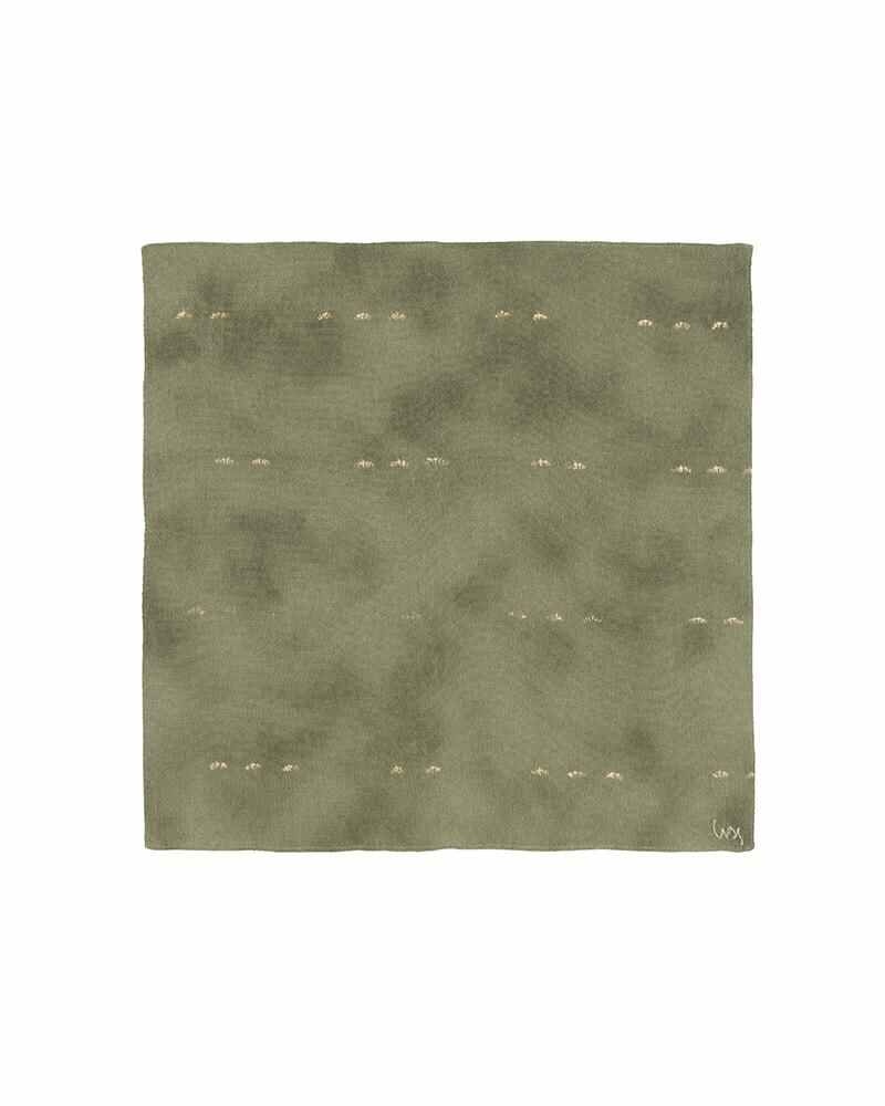 SILK BANDANA IRIS (CHIRIMEN) COLOR: BLACK, GREEN, BEIGE SIZE: ONE SIZE A Silk Bandana with a custom print Hand-stitched details 100% SILK UNIT:cm Please be aware that there may be slight variations in color or pattern from the images shown due to the nature of the fabric being used. Additionally the style will experience some shrinkage when washed. SIZE HEIGHT WIDTH ONE SIZE 45 45