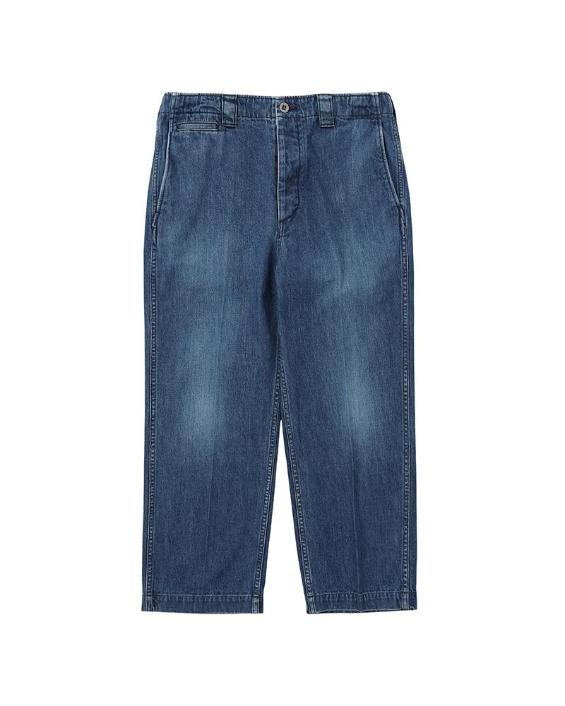 SS LEAGUERS PANTS DMGD COLOR: ONE COLOR SIZE: 1, 2, 3, 4, 5 Custom 11 oz. Denim Pants Damaged Finish Straight Leg silhouette Cropped Length High-rise Red Selvedge Custom "PEERLESS" engraved metal button Custom cinch-back detail 100% COTTON UNIT:cm : Please be aware that the vintage fabric, bandanas, blanket, and african indigo fabric used may vary in color and pattern from item to item. With time, these fabrics may also become weaker and less tear-resistant. Also, due to the use of natural dyes, the outward appearance of items may vary slightly from one another. For certain items, mud may be applied for an added effect. Products may shrink slightly when washed. SIZE LENGTH INSEAM WAIST THIGH WIDTH HEM 1 89.5 59.5 80 29.9 20.9 2 92 61.5 85 31.1 22.1 3 94.5 63.5 90 32.3 23.3 4 97 65.5 95 33.5 24.5 5 99.5 67.5 100 34.7 25.7