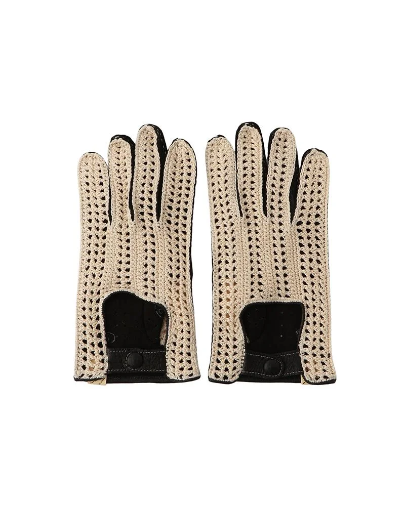VMC CROCHET DRIVING GLOVES COLOR: BLACK, BROWN SIZE: S, ML, L, XL, XXL A Hand Sewn pair of Driving Gloves made with a knit cotton crochet material that is combined with Italian peccary leather UNIT:cm : The natural leather hides have been specially treated to create a unique texture which creates wrinkles and variation in size, expression, and hue where no two pieces are alike. Please be aware that there may be slight variations in color or pattern from the images shown due to the nature of the material being used. SIZE LENGTH WIDTH S 22 10 ML 22.5 10.5 L 23 11 XL 23.5 11.5 XXL 24 12