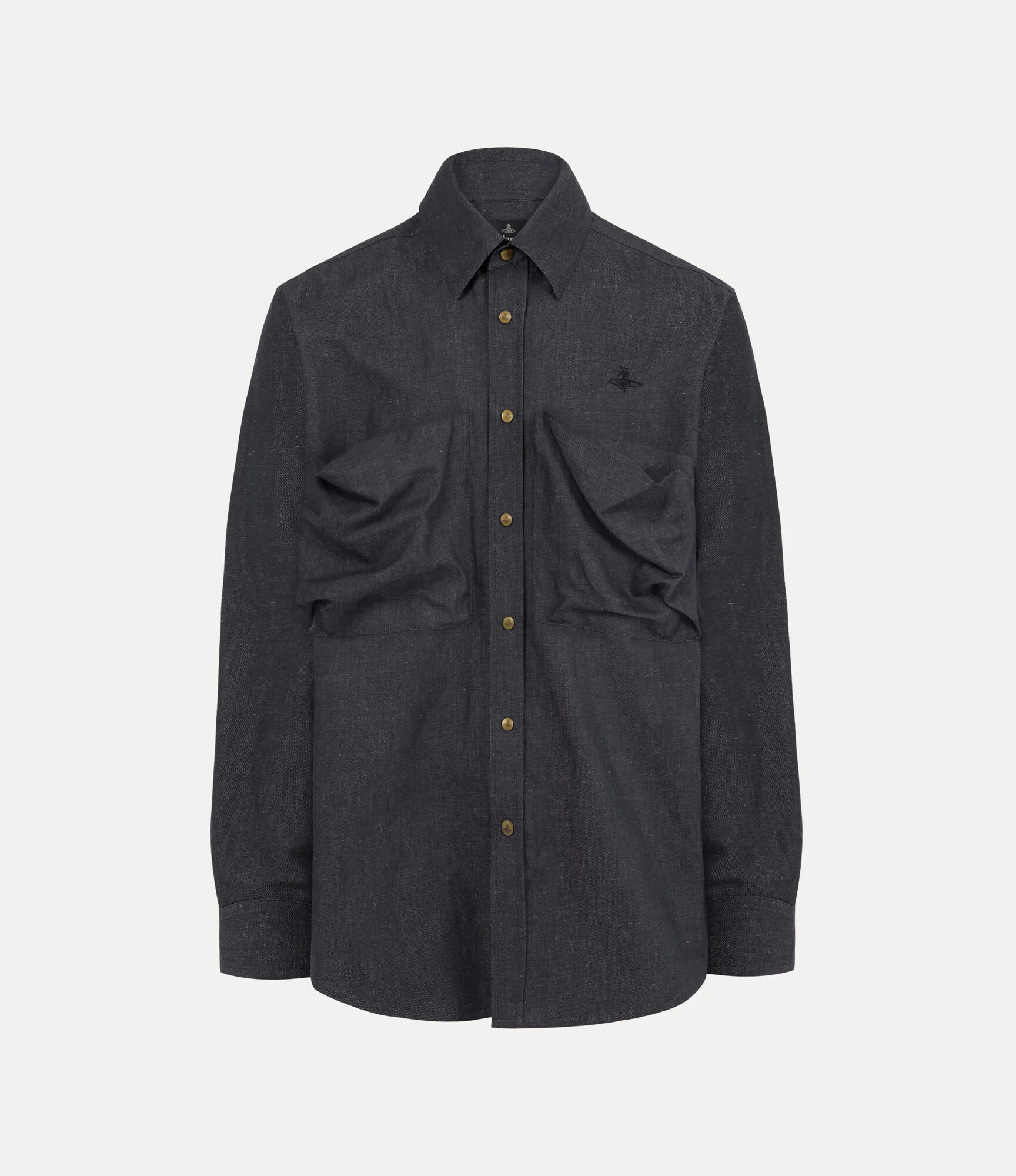 The Achilles overshirt revives the house’s signature ‘Achilles’ system from Vivienne’s 1981 Gold Label collection. Crafted from a cotton–linen blend, the piece features an oversized silhouette with pleated pockets on the front, finished with the signature graffiti orb embroidery in tonal thread. Code: 2401004J-W01D9--NAVY - Features an oversized silhouette - Classic collar - Utilitarian-inspired external pockets - Long sleeves with buttoned cuffs - Tonal topstitching - Graffiti orb embroidery - Unlined design - Made in Italy COMPOSITION - 55% Organic cotton - 45% Linen - Organic fibres are natural fibres grown with strict rules concerning the use of synthetic pesticides, insecticides, or herbicides and GMOs (Genetic Modified Organisms).