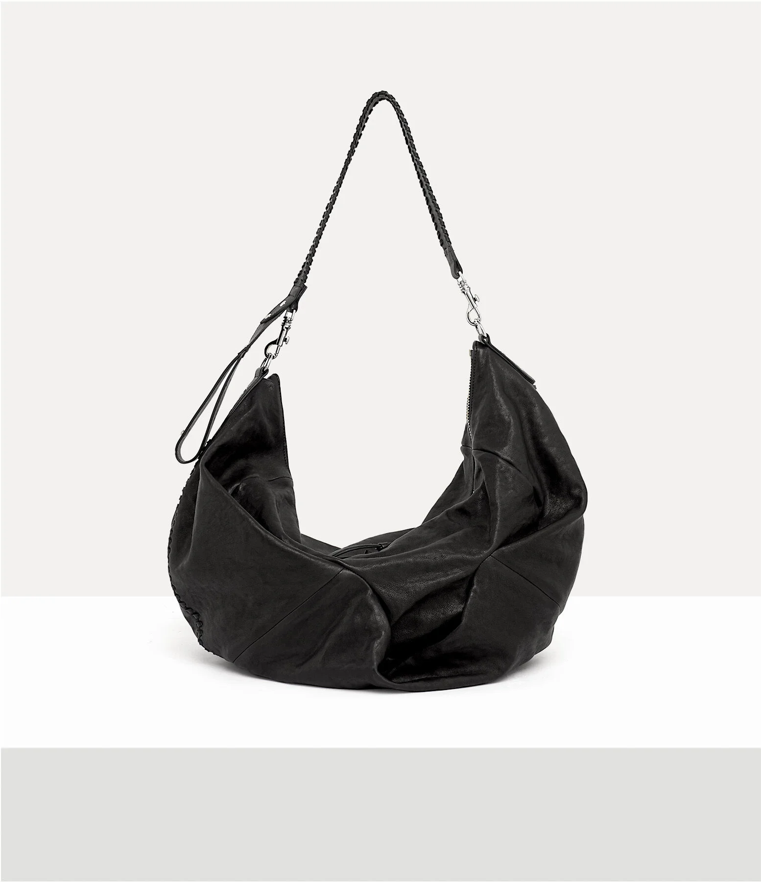 Our Agnes Large Shoulder bag offers a draped silhouette, emulating the archival curved pattern-cutting techniques first seen in our Autumn-Winter 2001 collection, ‘Wild Beauty’. The design features a washed leather finish, complete with a woven leather handle - recalling the bondage whips sold in our iconic SEX boutique. Code: 8053195494217 - Features polished hardware - 'Broken Pinstripe' interior lining - Zipped interior pocket - Top-zip fastening - Removable strap - Three-dimensional orb - Soft silhouette - Length 58cm, height 44cm, depth 16cm - Made in Italy COMPOSITION - Main material: 100% calf leather - Lining: 100% cotton