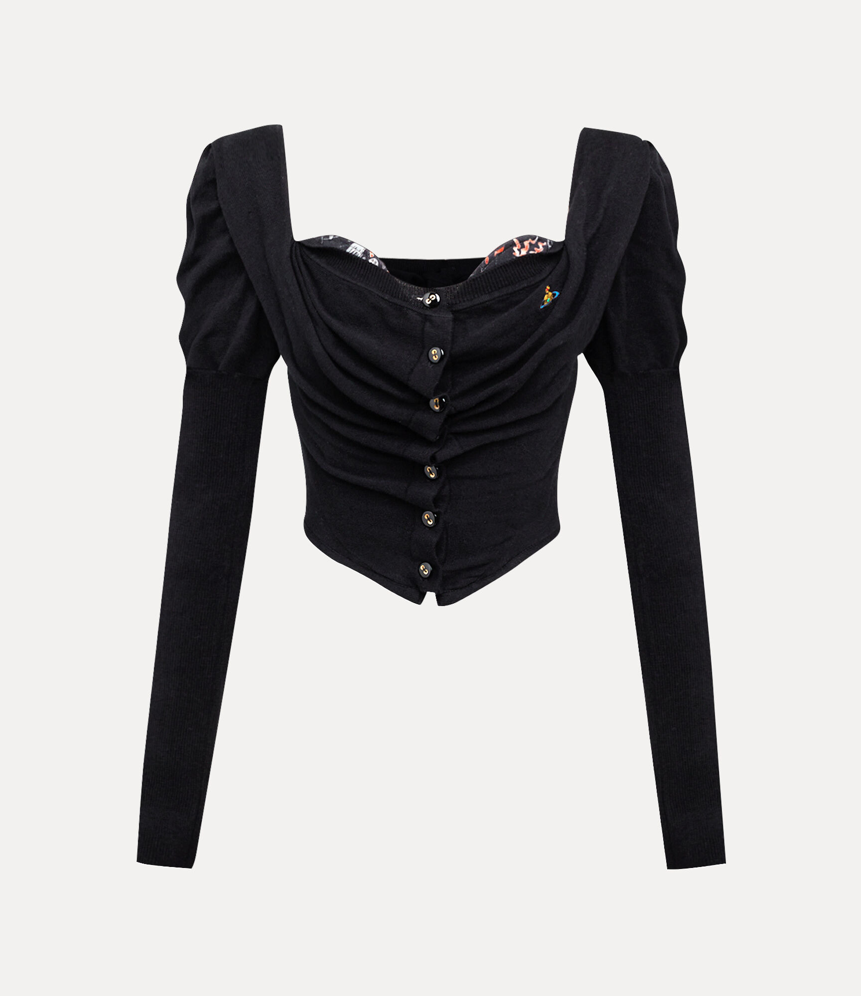 Our Bea Corset cardigan is crafted from a soft cotton-cashmere blend and fastens with shimmering mother-of-pearl buttons. Featuring a contrasting corset-style design and elegant drapery at the neckline, the piece is finished with intricately puffed shoulders for a sculptural silhouette. Code: 1803002V-Y001V--BLACK - Features our classic orb embroidery - Cropped design - Sweetheart neckline - Draped collar - Fitted body - Long, ribbed finishings - Contrasting corset - Woven label at the neckline - Made in Italy - Model is 5'10/178cm and is wearing size 38 COMPOSITION - 85% Cotton - 15% Cashmere
