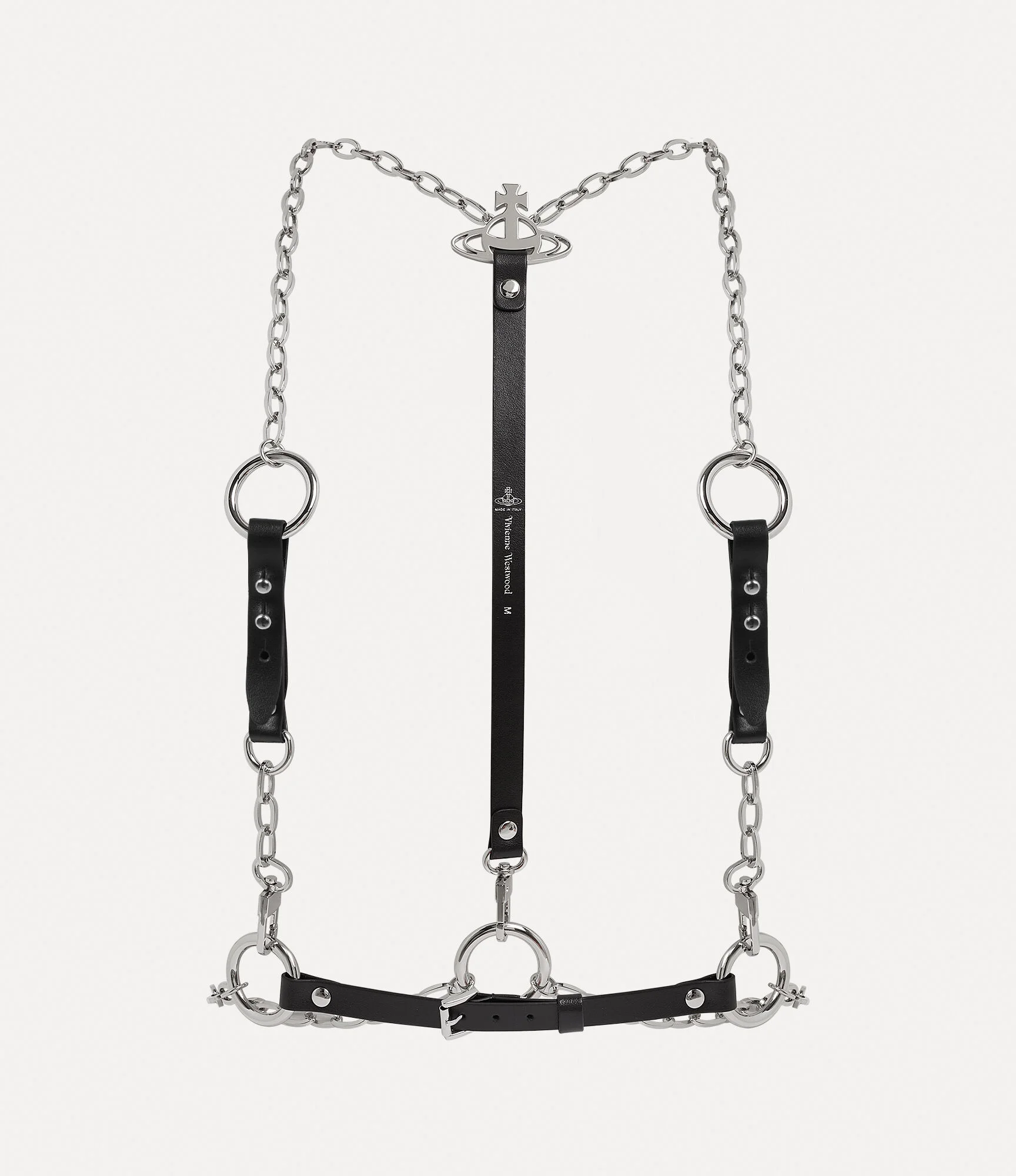 Our Chain harness features bondage-inspired elements, reminiscent of our ‘Erotic Zones' collection from Spring-Summer 1995. The silver-tone chain detail is finished with our classic orb branding, evoking Vivienne's vision of taking tradition into the future. Code: 82110001U-L002V--BLACK - Made in Italy - Hoop and stud detailing - Line orb motif - Polished hardware - Buckle fastening COMPOSITION - 100% Leather
