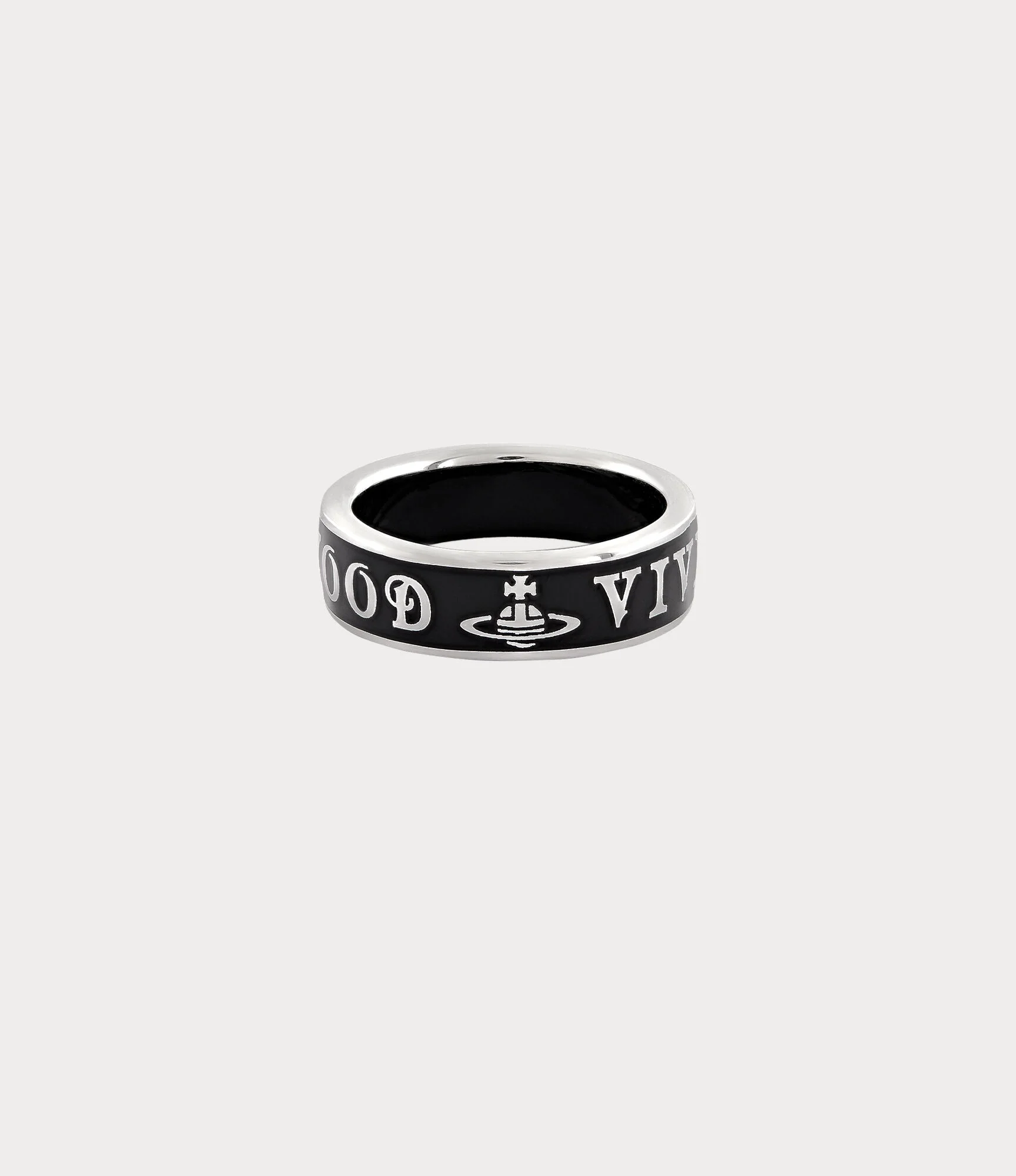 Inspired by the Conduit Street bangle, our silver-tone Conduit Street ring is made from recycled silver and features text that reads 'Vivienne Westwood'. Code: 64040017-01P107-IM-PLATINUM-BLACK-Enamel - Silver-tone plating - Enamel detailing - Engraved inner band - Thin-band design - Measurements: band width 0.5cm COMPOSITION - 100% Recycled silver