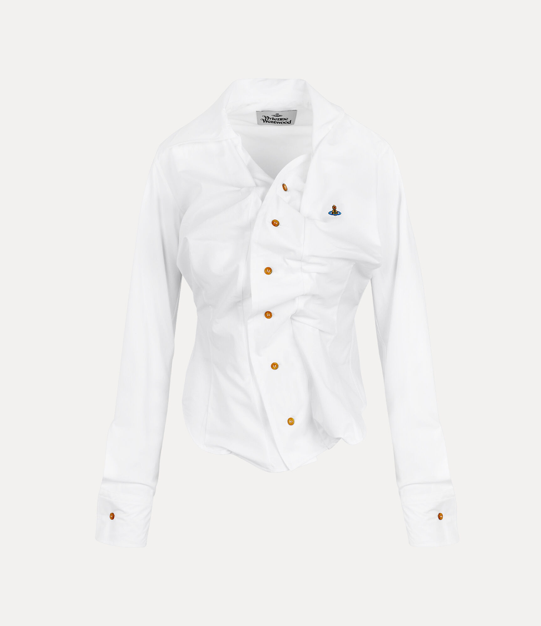 Made of organic certified cotton sourced from farms that take a regenerative approach, the Drunken shirt features elements of our 'alcoholic' tailoring system, such as an off-balance silhouette, drape detailing, and an asymmetric hemline. Code: 1501000C-W009Q-PI-WHITE - Front button fastening - Buttoned cuffs - Orb embroidery - Darting along the front - Long sleeves - Off-centre collar - Contorted seams - Cinched-in waist - The model is 5'11/180cm and is wearing a size 40. COMPOSITION - 100% Organic cotton - This fabric contains organic cotton. Organic cotton fibres are natural fibres grown with ought the use of synthetic pesticides, insecticides, or herbicides and GMOs (Genetic Modified Organisms). We are committed to using certified organic cotton as organic farming systems avoid the risks that hazardous chemicals pose to human health and the environment. They can be more financially resilient for farmers, as well as helping to replenish and maintain healthy fertile soil.