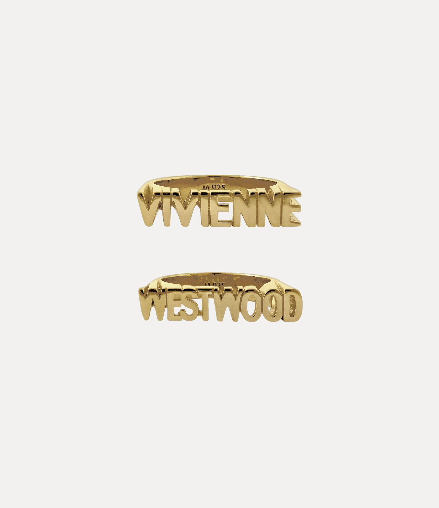 Our Essex ring is crafted from recycled silver and finished with polished gold-tone plating. Featuring two bold, all-metal bands, one spelling ‘Vivienne’, the other ‘Westwood’, the design is accentuated with intricate cut-out details that trace the contours of each letter. Code: 6404018I-01R001--GOLD - Features a polished finish - Bold block-letter design with angular edges - Contoured interior band for comfortable fit - Sculptural lettering raised from the ring base - Can be worn stacked or separately - Hallmarked interior - Unisex design COMPOSITION - Main material: 100% recycled silver - Crystal detailing - Gold-tone plating - We plate all our sterling silver products, as this prevents tarnishing and increases durability.
