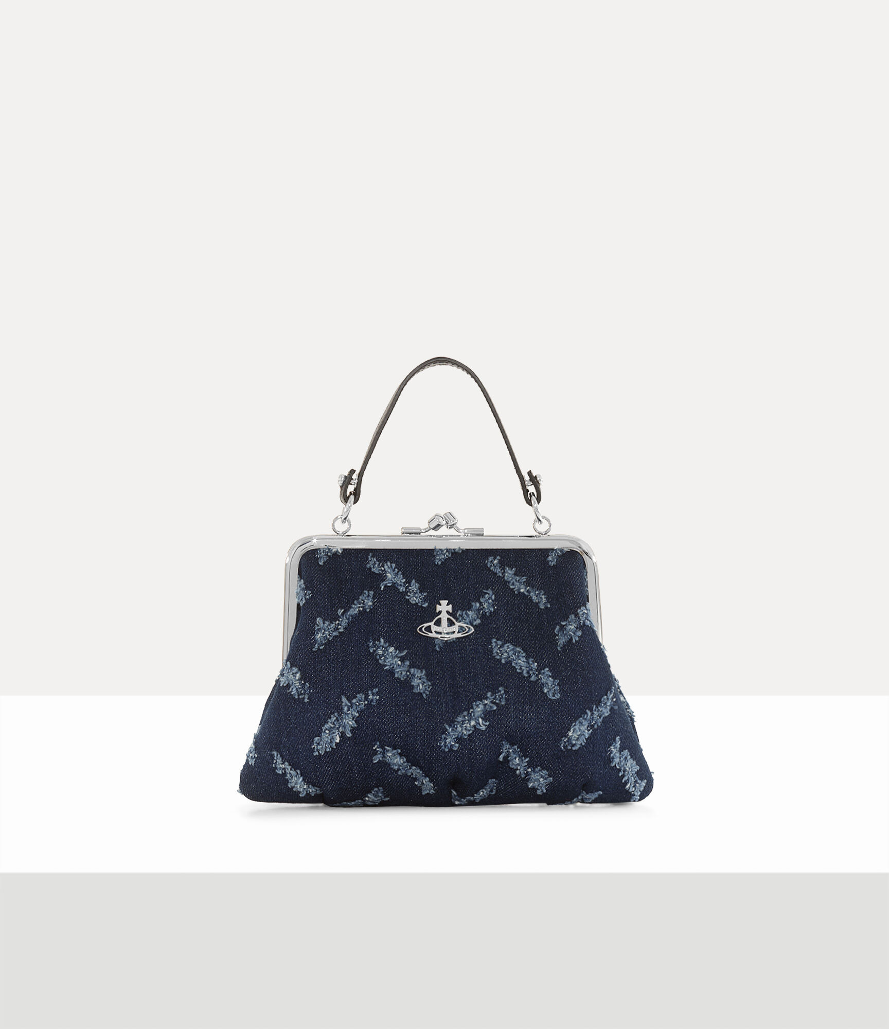 Our Granny Frame purse is adorned with this season's ‘Ripped’ denim motif, recalling our Spring–Summer 1991 collection, 'Cut, Slash and Pull'. Inspired by the 16th-century tradition of slashing and pricking garments to reveal the layers beneath, the design is complete with a silver-tone 'Line Orb' motif at the front. Code: 8053195304639 - Features polished hardware - Zipped interior pocket - Interior lining - Removable chain strap - Top-handle silhouette - Compact size - Reinforced corners and edges - Clasp fastening at the top - Height 17cm, width 22cm, depth 7cm - Made in Italy COMPOSITION - Main material: 100% cotton - Hardware: silver-tone brass - Internal lining: cotton drill - Trims: 100% calf leather in black