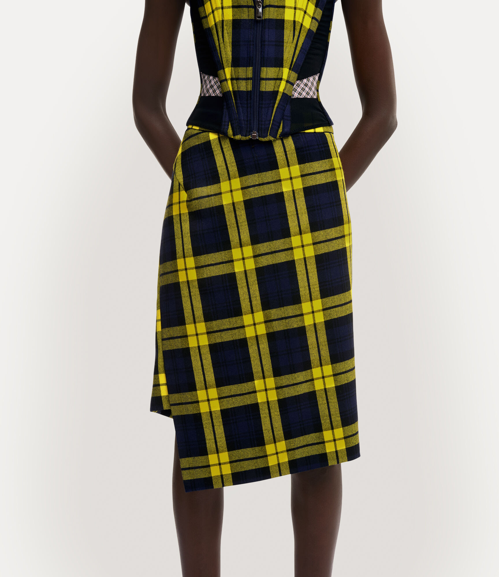 Our Infinity Midi skirt is offered in the 'Moonshine' tartan this season, complete with vibrant hues and the house's engraved amber-coloured button fastening. The piece features a high waistband that delicately wraps around the hips, forming an asymmetric hemline. Code: 1K01002D-W0175--NAVY-YELLOW - Features an orb-jacquard lining - Fits true to size, please take your normal size - Concealed zip fastening - Button fastening - Midi-length style - Made in Italy COMPOSITION - 100% Wool