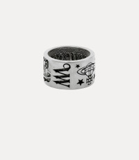 The Lancelot ring, crafted from platinum-plated recycled silver, is inscribed with signature phrases and motifs inspired by the house's history. The wide statement band is finished with antique-effect detailing, while the inner band features an embossed 'Vivienne Westwood' inscription in the signature lettering. Code: 6402001L-01P017--ANTIQUE-PLATINUM - Features a polished finish - Platinum-tone plating - Inscribed with house motifs - Wide band design - Engraved inner - Textured surface with oxidised accents - Unisex design COMPOSITION - Main material: 100% recycled silver - Platinum-tone plating - We plate all our sterling silver products, as this prevents tarnishing and increases durability.