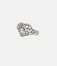 Our Lee ring is sculpted from recycled silver and finished with a radiant platinum-tone plating. The face takes the form of an asymmetric heart, a nod to Vivienne’s affection for humanity and the planet, complete with a crystal-encrusted stars and orb motifs scattered across its surface. Code: 6402001B-01P102--PLATINUM-WHITE-CZ - Features a bold, oversized shape - Raised, domed structure - Star-shaped stone settings - Clear cubic zirconia stones - Tapered band - Scattered stone placement - Hollowed construction allows light to pass through COMPOSITION - Main material: 100% recycled silver - Crystal detailing - Platinum-tone plating - We plate all our sterling silver products, as this prevents tarnishing and increases durability.