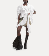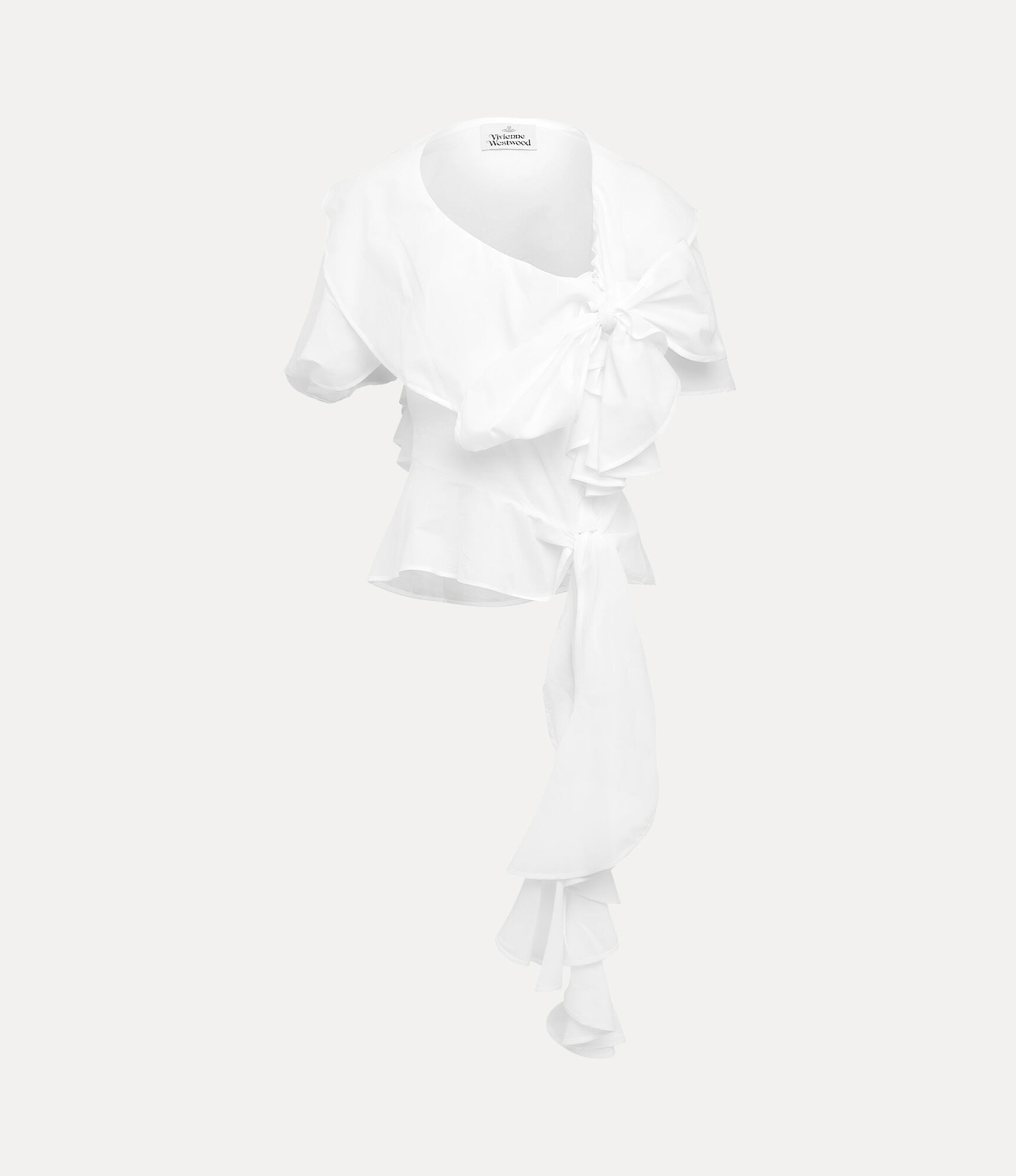 Our Lola Ruffle top drapes across the body with deliberate asymmetry to create a voluminous silhouette, finished with the house’s signature bow motifs, cascading into sweeping ruffle details. Cinching at the waist, the piece is framed by a romantic neckline and softly puffed sleeves. Code: 15050013-W0187--WHITE - Features an asymmetric neckline - Oversized bow detail - Draped ruffle extension - Short, slightly puffed sleeves - Cinched waist - Peplum hem - Sculptural - Ruching detailing - Model is 5'9/177cm and is wearing a size 40 - Made in Italy COMPOSITION - 100% Organic cotton - The fabric is piece-dyed and has a semi-sheer finish - Organic fibres are natural fibres grown with strict rules concerning the use of synthetic pesticides, insecticides, or herbicides and GMOs (Genetic Modified Organisms).