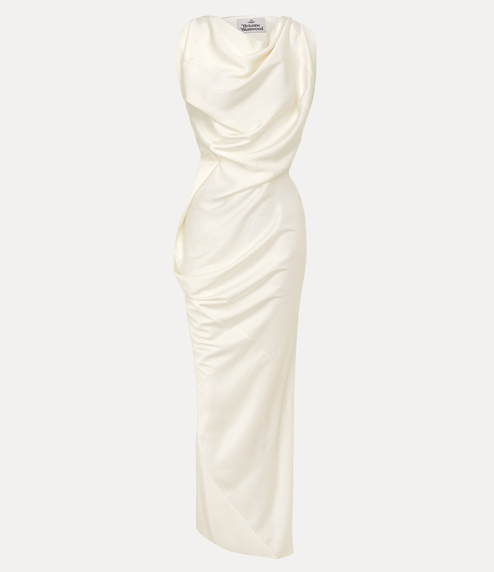 The Long Fond dress features elegant drapery at the neckline and waist, falling into an elongated column silhouette with an asymmetric hemline. Detailed with additional draping at the back, the piece fastens with a concealed side zip closure for a smooth finish. Code: 110103A5-W01AD--IVORY - Features a maxi-length silhouette - Sleeveless cut - Draped neckline - Gathered draping - Cinched waist - Column silhouette - Asymmetric drape - Concealed zip - Minimalist design - Satin finish - Model is 5'9/177cm and is wearing a size 40 - Made in Italy COMPOSITION - 100% Recycled polyester