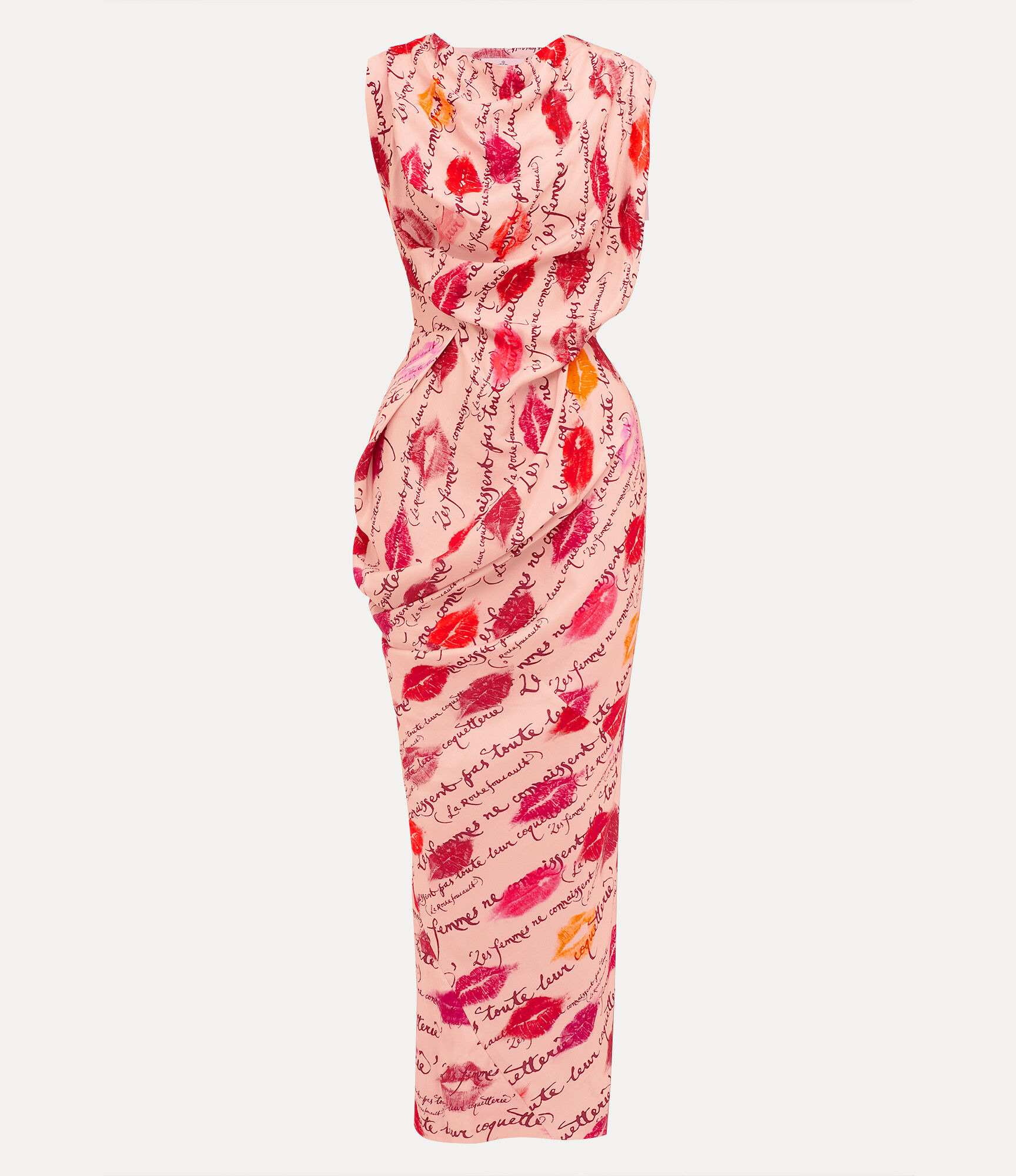 Our Long Fond dress is crafted from satin-like viscose, featuring elegant drapery at the neckline and waist that gently falls into a slim column silhouette. The piece is adorned with the ‘Les Femmes Ne Connaissent Pas Toute Leur Coquetterie’ artwork, written in Vivienne’s own handwriting - first introduced in the Spring–Summer 1996 collection. Code: 1101039R-W017G--KISSES - Features a high round neckline - Gathered side ruching - Lip print pattern - Script text overlay - Draped body silhouette - Draped back detail - Cinched waist - Floor-length hemline - Sleeveless design - Model is 5'9/177cm and is wearing a size 40 - Made in Italy COMPOSITION - 100% Viscose