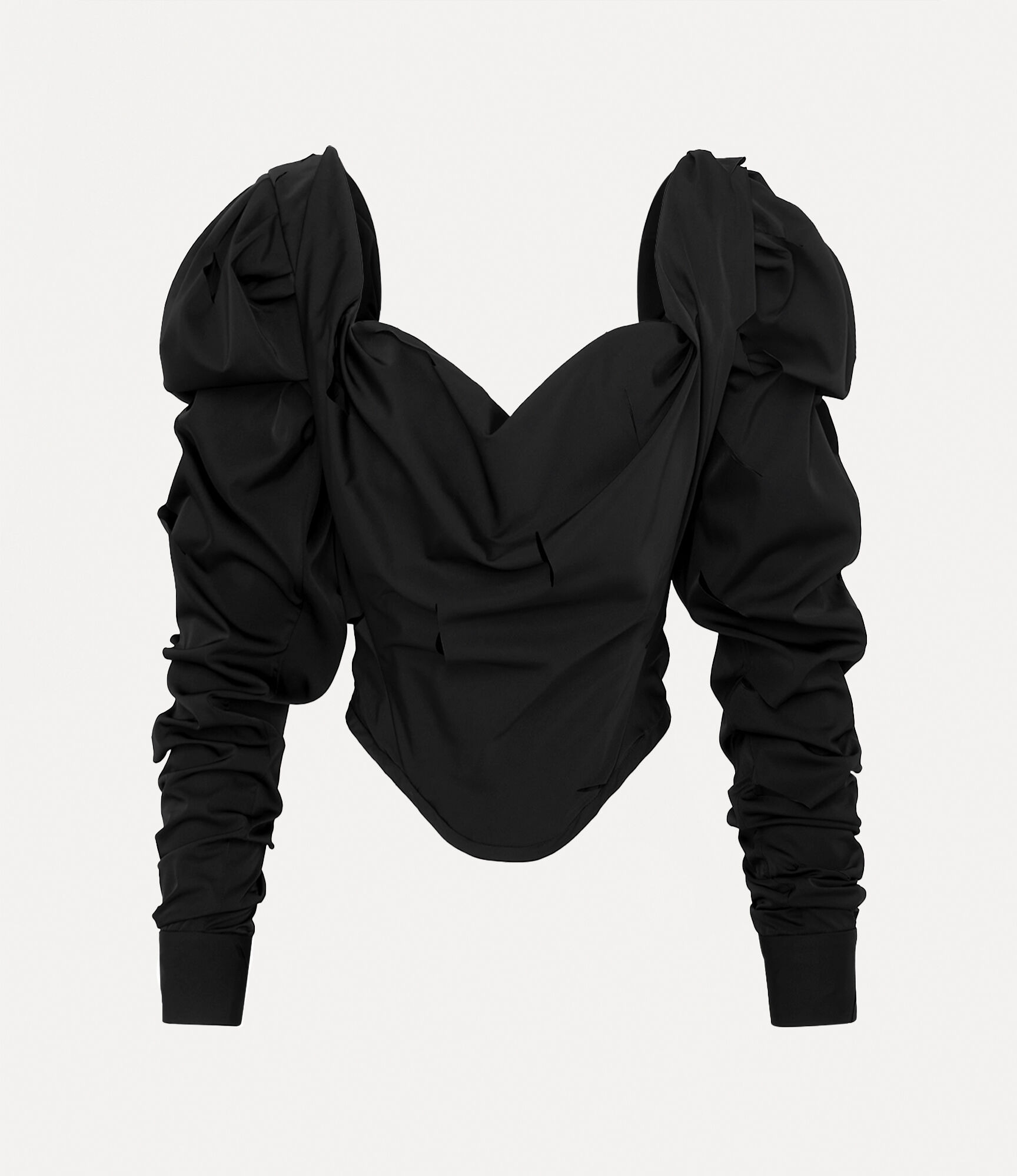 Our LS Sunday Corset Top is crafted from richly dyed taffeta and features a delicate laser-cut design, inspired by artwork from the Andreas Kronthaler Autumn–Winter 2024–2025 show. The piece is shaped with a sculpted corset-style bodice and finishes with an orb-engraved zip puller at the back. Code: 1503003G-W018O--BLACK - Features voluminous puff sleeves with gathered detailing - Sweetheart neckline - Fitted long sleeves with extended cuffs - Slight sheen - Internal boning - Asymmetric hem that curves at the front - Back zip fastening - Model is 5'11/180cm and is wearing a size 40 - Made in Italy COMPOSITION - 100% Polyester
