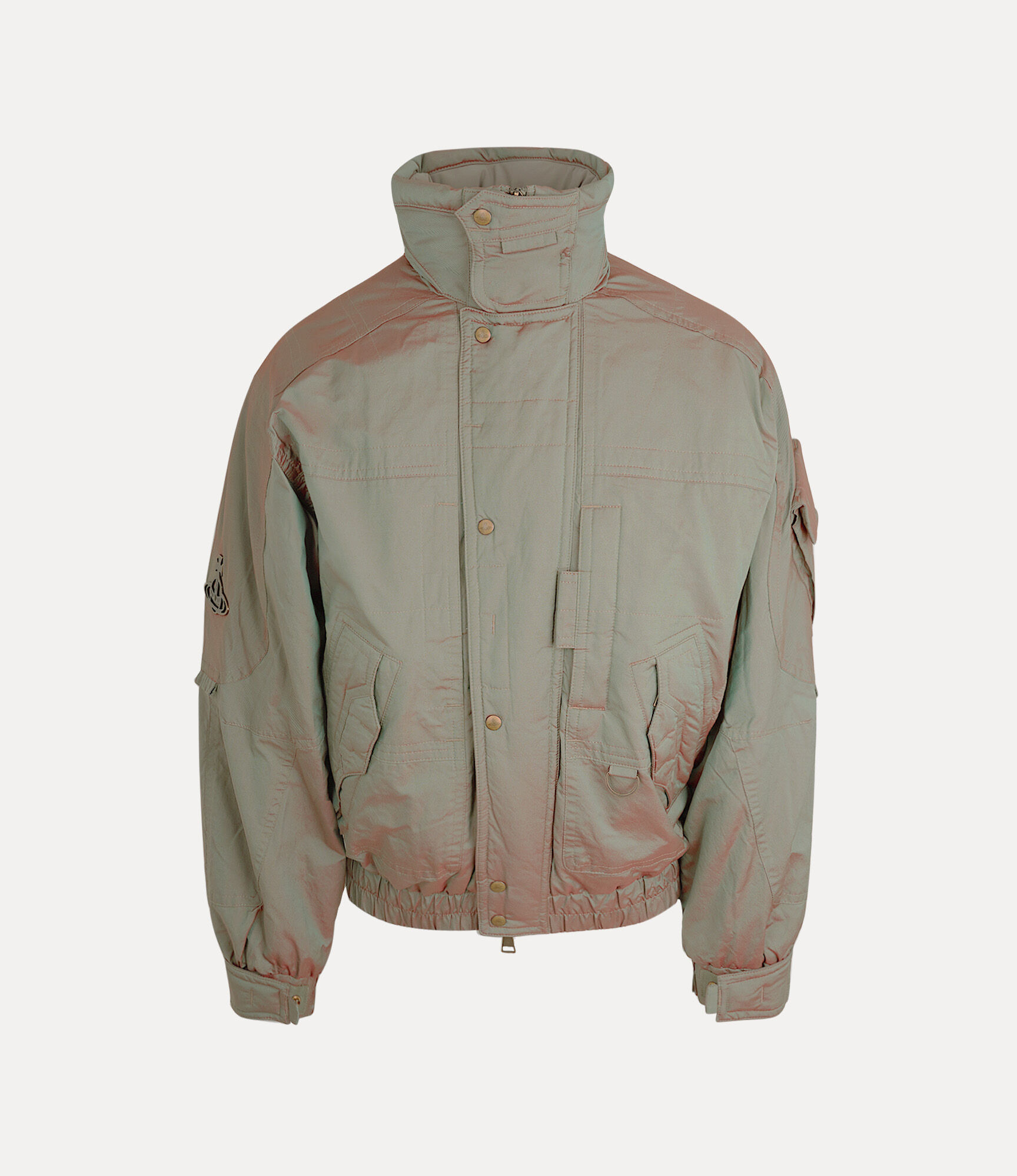 Our Nevada bomber jacket is crafted in a two-tone finish, characterised by a soft green-brown wash that offers a distressed, iridescent effect. Cut to a high funnel-neck silhouette with a secure strap fastening, the piece falls into long raglan sleeves and a slightly cropped, voluminous body. Code: 2203000K-W0189--SAGE-GREEN - Features front flap pockets - Utility sleeve pocket - Concealed front zip - Engraved snap buttons - Elasticated hemline - Elasticated cuffs - Orb detail - Relaxed fit - Boxy silhouette - Model is 6ft/183cm and wears a size 48 - Made in Italy COMPOSITION - 59% Cotton - 41% Polyester
