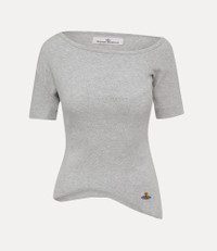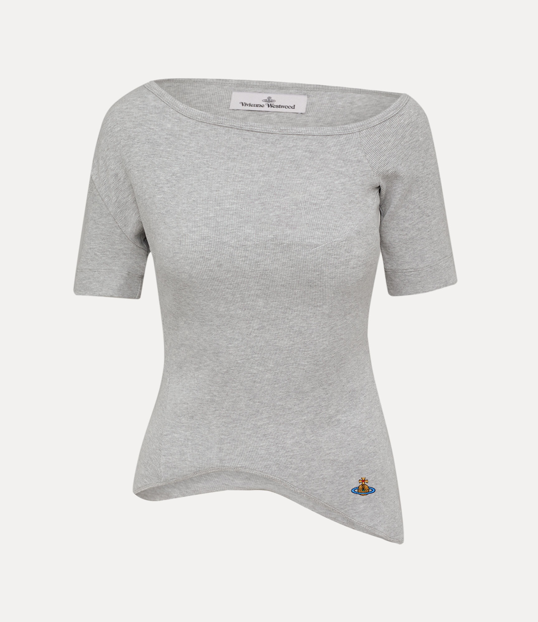Our Orgy Shoulder t-shirt is crafted from a soft cotton blend with a slight stretch, gently traced with delicate ribbed detailing throughout. Designed with a wide neckline that falls into a relaxed, off-shoulder silhouette, the piece is finished with a subtly cropped hem that defines the waist. Code: 1G010010-J009C--GREY-MELANGE - Features a fitted silhouette that contours the body - Asymmetric hemline - Short sleeves - Central embroidered multi-coloured orb - Lightweight, breathable finish - Darting detailing - Minimal seam detailing - Model is 5'10/178cm and is wearing size S COMPOSITION - 95% Cotton - 5% Elastane