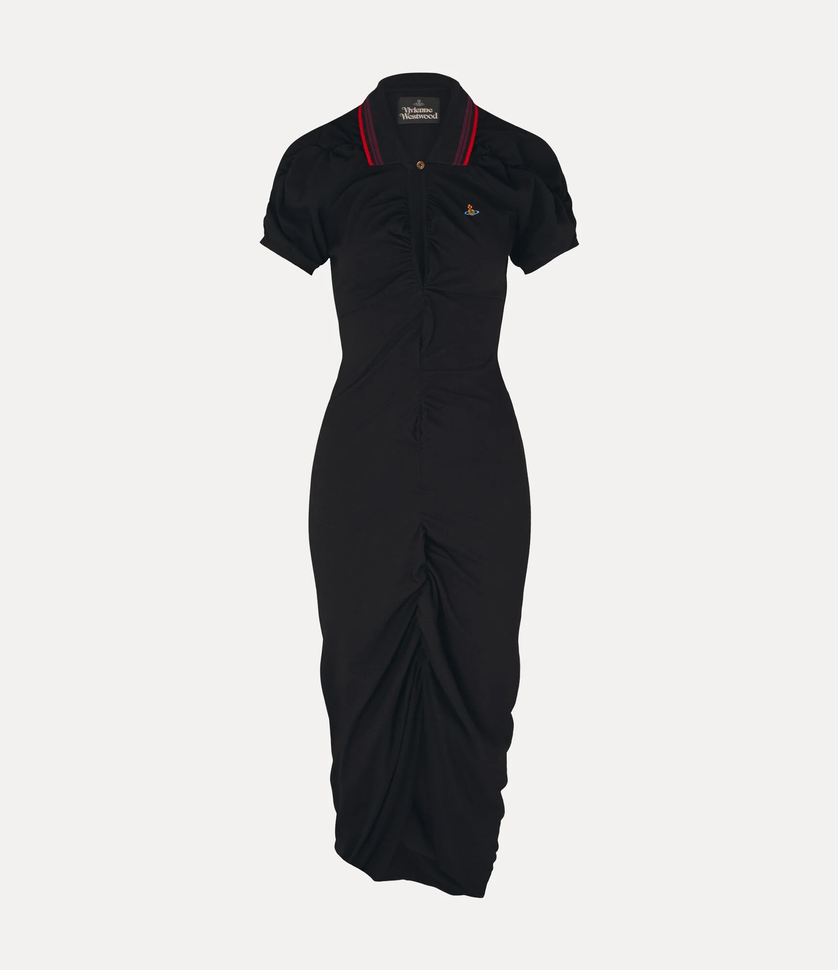 Our signature Pulling dress has been revisited this season, offered in soft cotton with a pique texture. The piece features Vivienne’s original experimental 'Pulling' pattern cutting system – where the garment is draped and pulled to create form, volume and structure. Code: 16010051-J00AU--BLACK - Features a fitted silhouette - Slight stretch - Turn-down collar - Ribbed trims - Multi-coloured orb detail - Engraved amber buttons - Split detail - Asymmetric hem - Model is 5'9/177cm and is wearing a size S COMPOSITION - 100% Organic cotton - Organic fibres are natural fibres grown with strict rules concerning the use of synthetic pesticides, insecticides, or herbicides and GMOs (Genetic Modified Organisms).