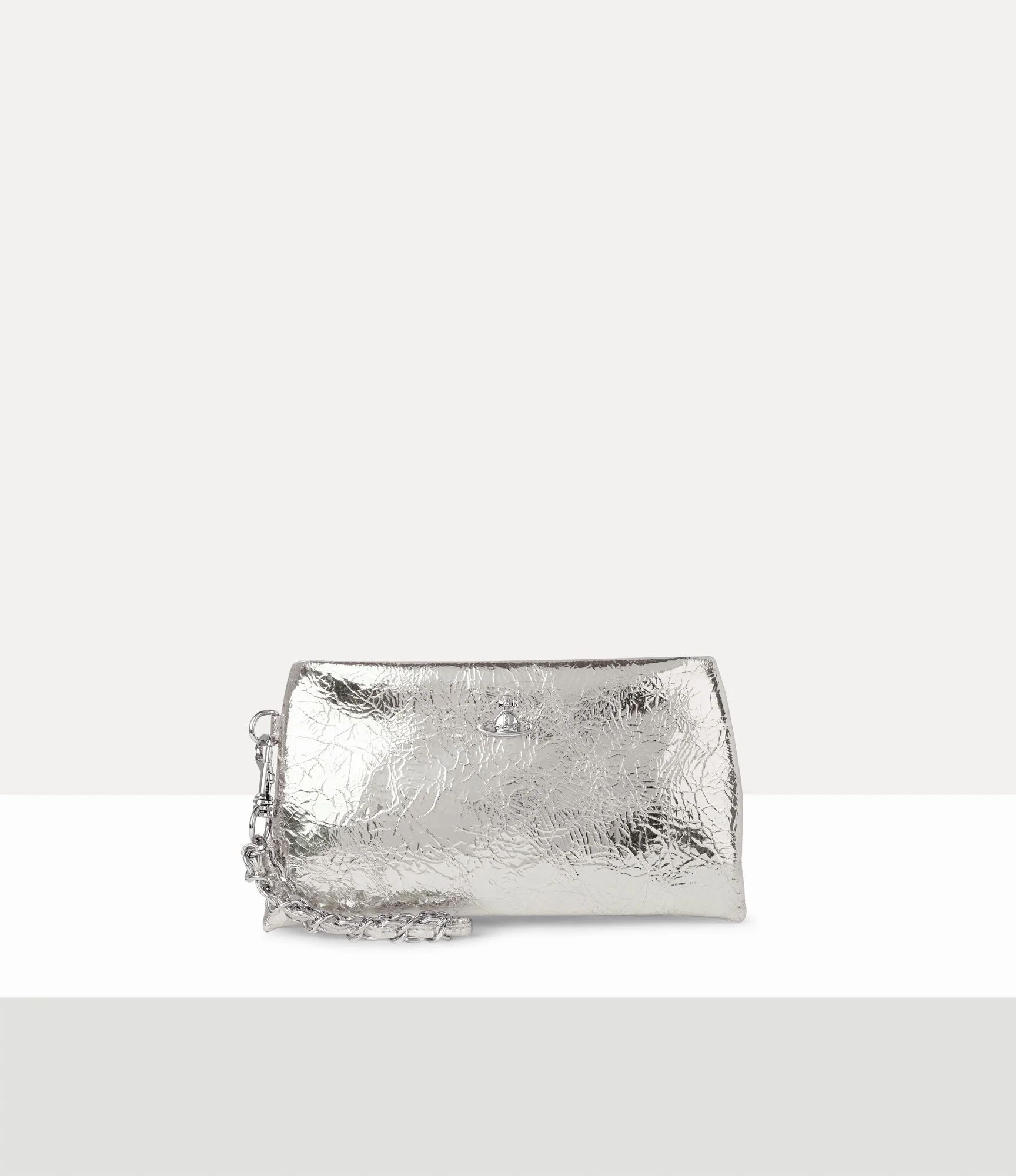 The Sadie wristlet pouch has been reimagined in metallic crinkle-effect leather, drawing from the house’s rich archive. The design features a silver-tone chain interwoven with tonal leather details, finished with a polished orb motif at the front - synonymous with Vivienne's vision of launching tradition into the future. Code: 8053195340064 - Features a soft silhouette - Detachable strap - Compact size - Flat base - Top-zip fastening - Interior lining - Shiny leather finish - Can fit your phone, card holder and small essentials - Length 24cm, height 13cm, depth 1cm - Made in Italy COMPOSITION - 100% Leather