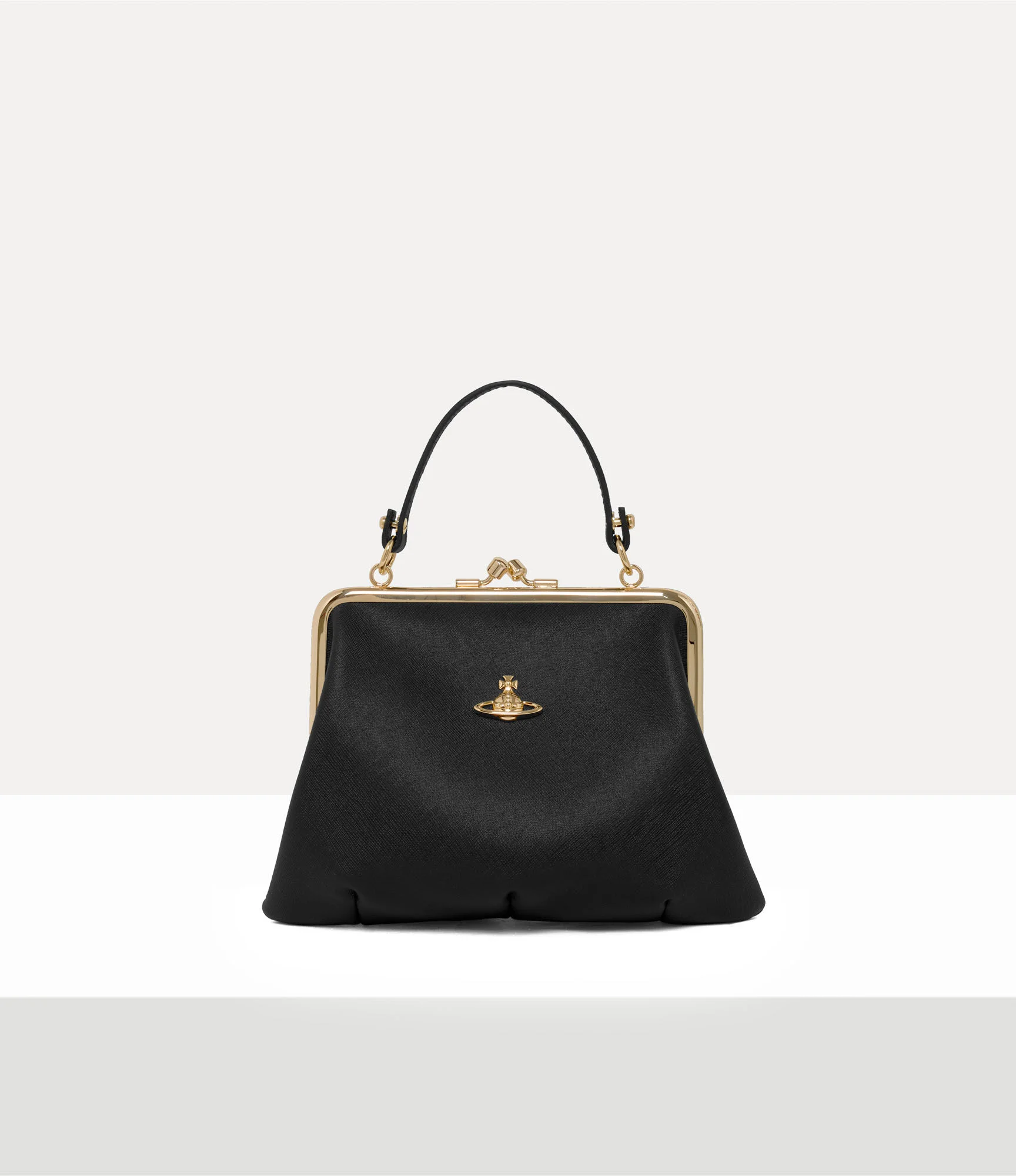 Our Saffiano-embossed Frame purse is finished with gold-tone metal hardware and a two-dimensional orb plaque on the front panel. Code: 8050889918141 - Gold-tone framework - Zipped interior pocket - Fully lined - Removable chain strap - Enamel-detail orb stud - Top-handle silhouette - Clasp fastening - Measurements: height 17cm, width 24cm, depth 5cm COMPOSITION - 100% Lamb leather - Recycled cotton lining