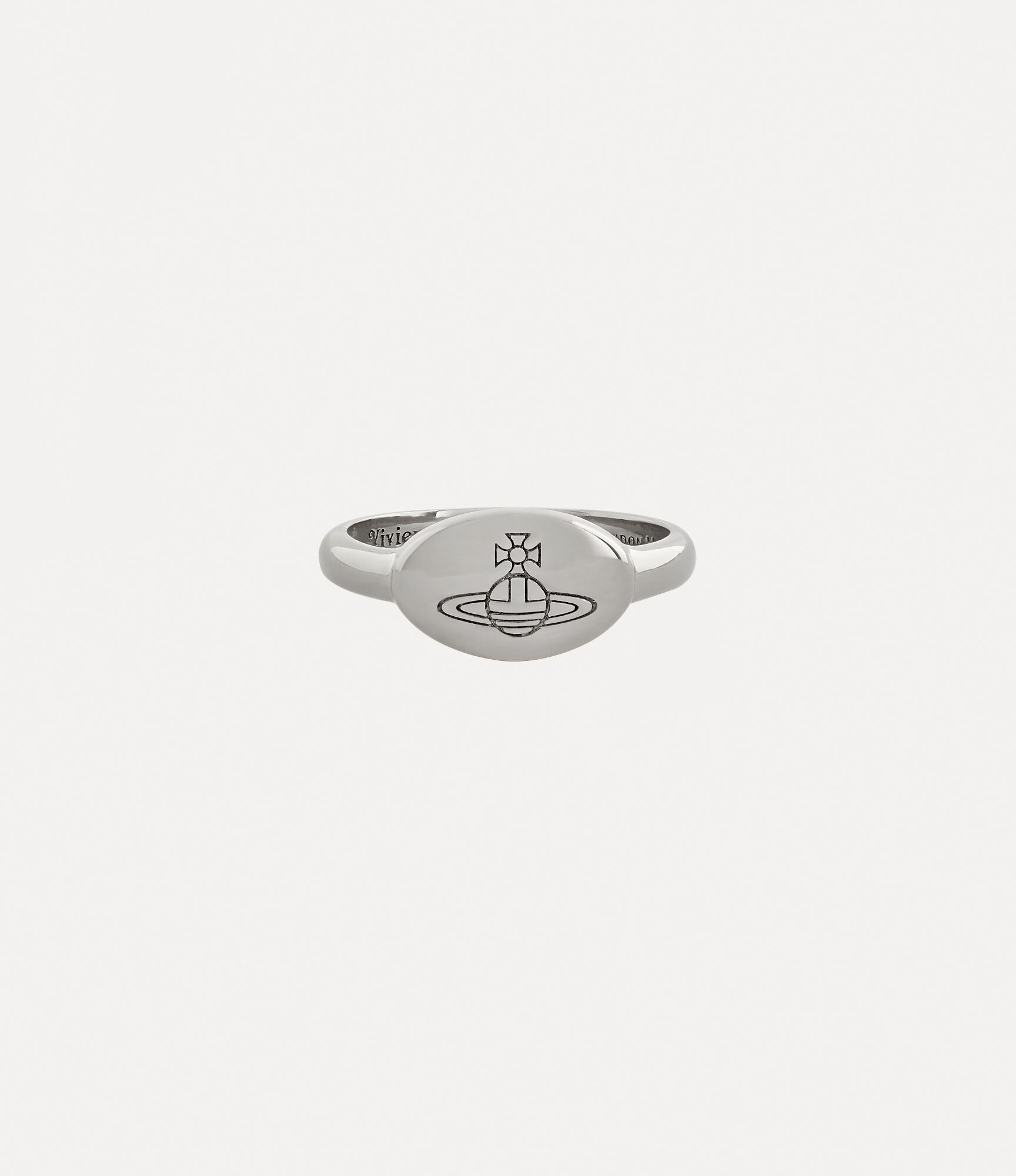 Our Tilly ring features a classic signet silhouette, complete with a recycled silver finish and enhanced by platinum-tone plating. This Vivienne Westwood ring is adorned with an oval-shaped face, featuring an engraving of our signature line orb, enriched with patina to elevate the overall aesthetic - recalling Vivienne's vision of launching tradition into the future. Code: 64020007-01P019-CN-Platinum - Features a polished finish - Engraved orb motif - Thin-band design - Engraved interior - Weight: 1.55g - Measurements: face height 0.7cm, width 1cm COMPOSITION - 100% Recycled silver