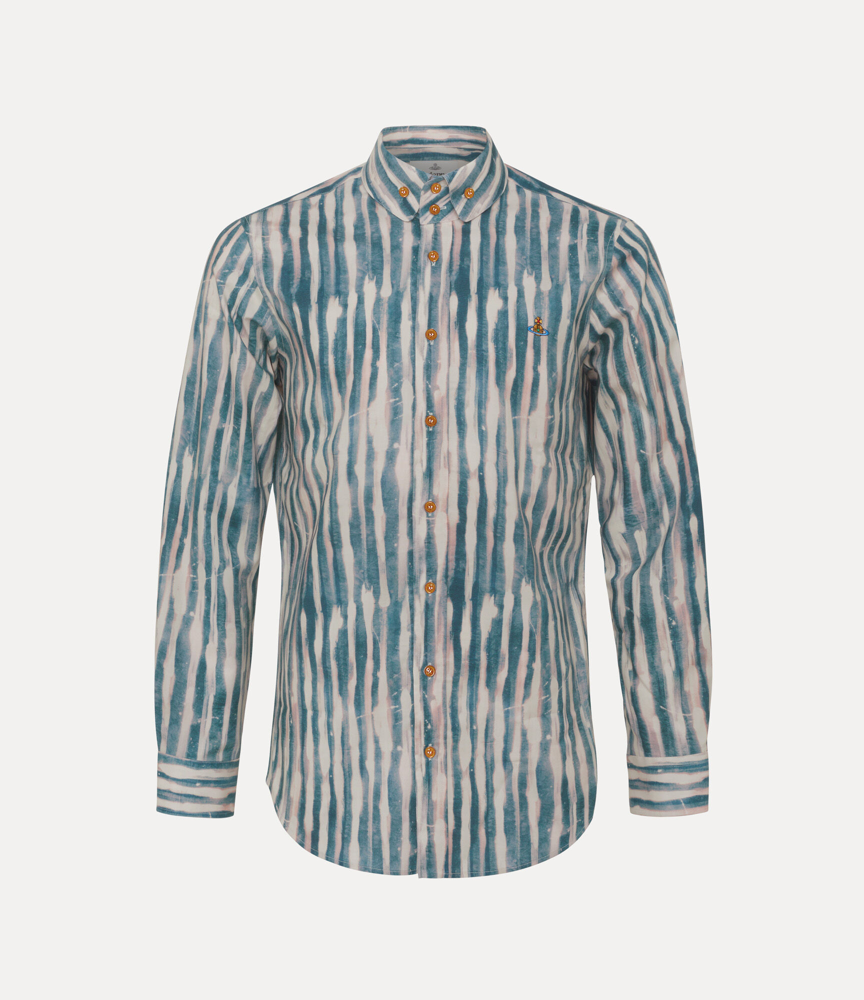 Our Two Button Krall shirt features the house's signature two-button collar, complete with our signature orb embroidery on the left-hand side of the chest. Crafted from soft cotton, the piece offers expressive, rough hand-painted brushstrokes and an overdyed finish for a unique, textured look. Code: 24010005-W018R--PAINTED-STRIPES - Features long sleeves - Fits true to size - Front-button fastening - Slightly curved hemline - Single-button barrel cuffs - Tailored fit - Contrast inner collar stitching - Multi-coloured emblem COMPOSITION - 100% Cotton - The material of our regenerative poplin contains 100% cotton sourced from farms that practice regenerative agriculture. Regenerative agriculture focuses on farming systems that enhance local ecosystems, increase biodiversity and strengthen the health, vitality and fertility of farm soil.